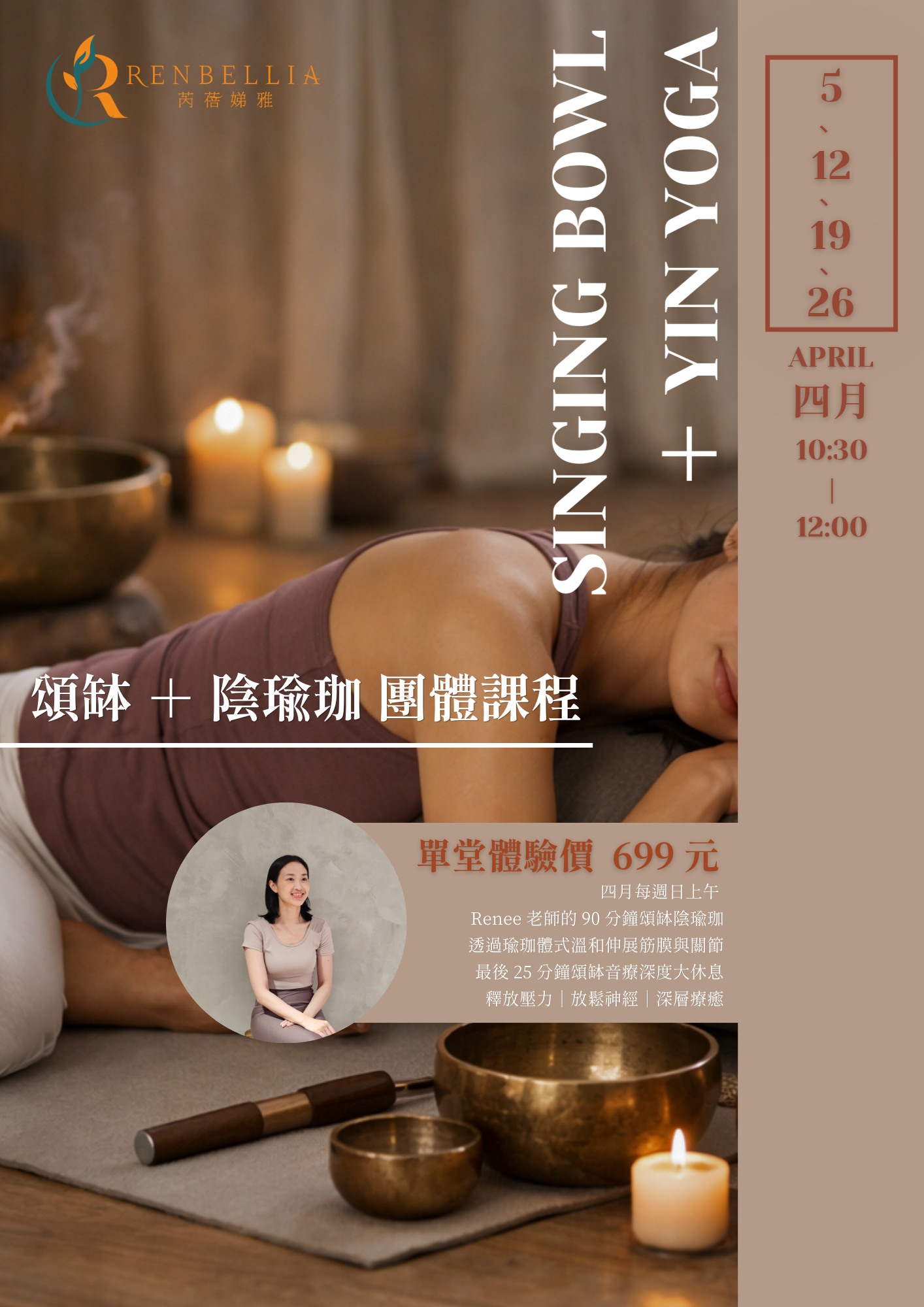 四月每週日上午 Renee 老師的 90 分鐘頌缽陰瑜珈 透過瑜珈體式溫和伸展筋膜與關節 最後 25 分鐘頌缽音療深度大休息釋放壓力|放鬆神經|深層療癒