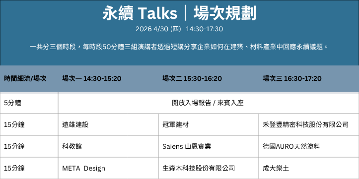 【永續 Talks】是一場輕鬆卻充滿收穫的交流活動,邀請來自建設與建材產業的永續夥伴,以15分鐘短講形式,分享他們如何在日常生活看不見的地方,實踐節能、健康與環境友善的理念。透過簡單易懂的方式,帶你認識居住空間背後的設計思維與關鍵選擇。