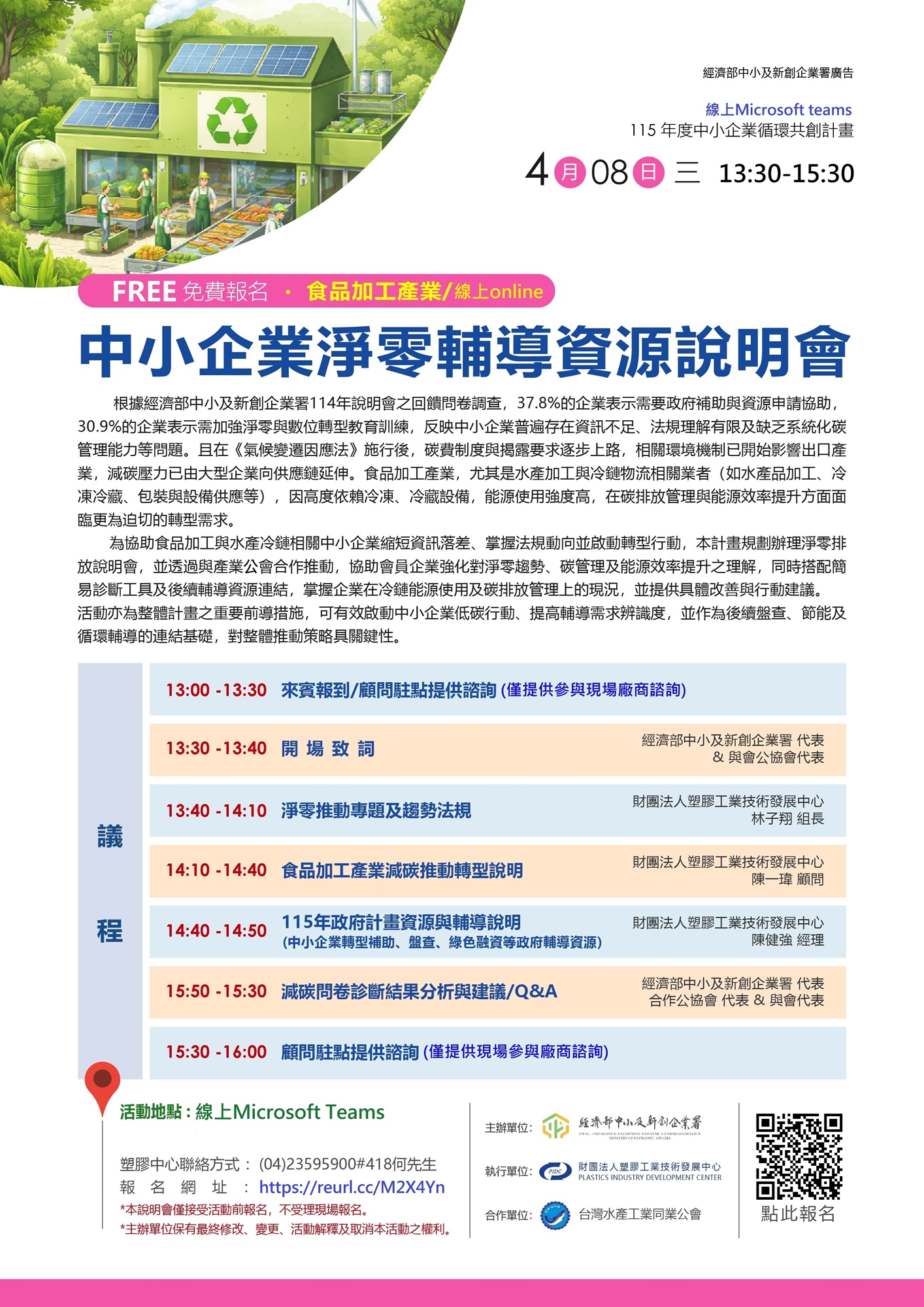 14:40~15:00 | 115年政府計畫資源與輔導說明(中小企業轉型補助、盤查、綠色融資等政府輔導資源) | 財團法人塑膠工業技術發展中心 陳健強 經理 |
