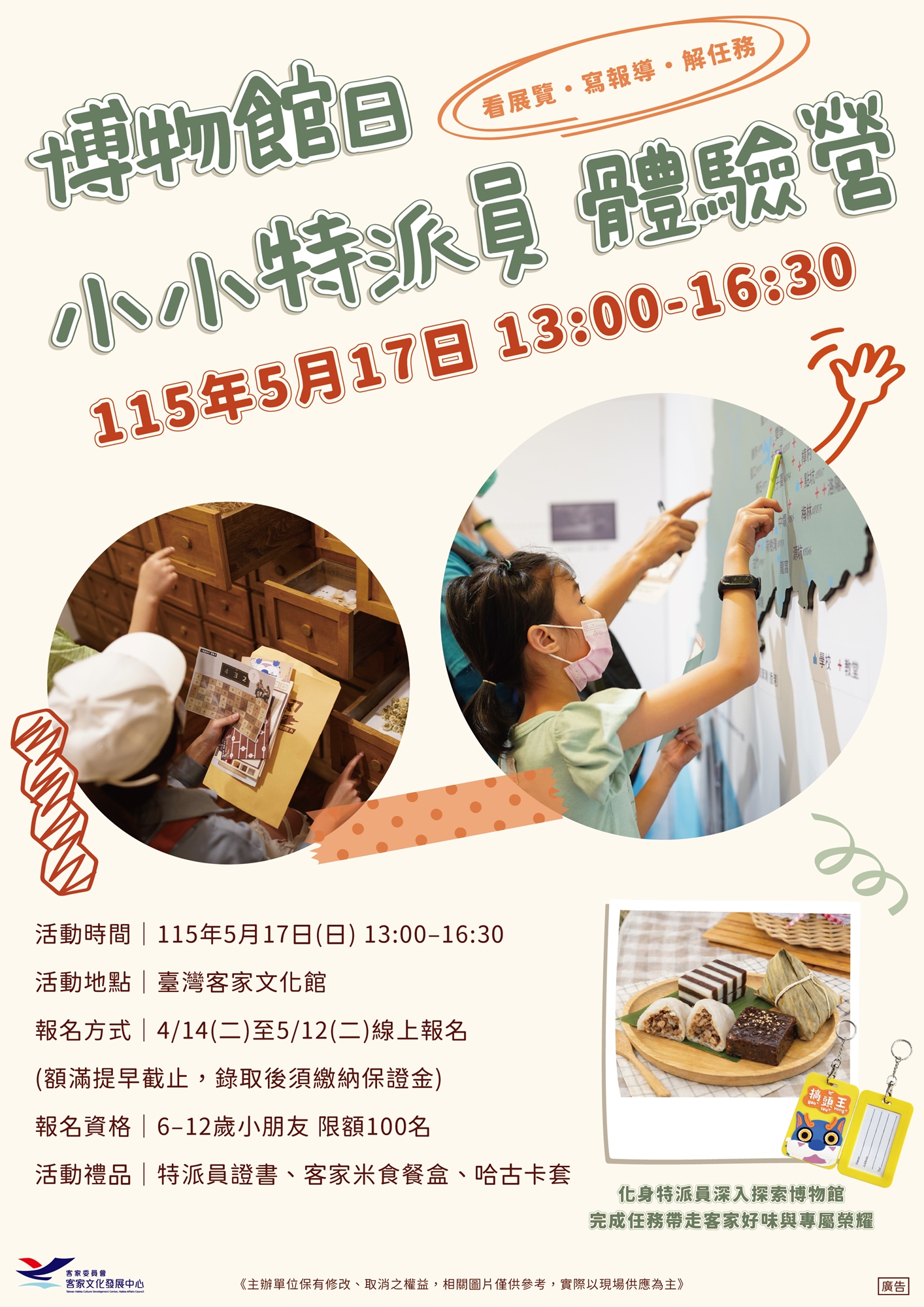 - 活動獎勵:參加且完成任務即可獲得「特派員證書」、「客家米食餐盒」及「哈古卡套」一份