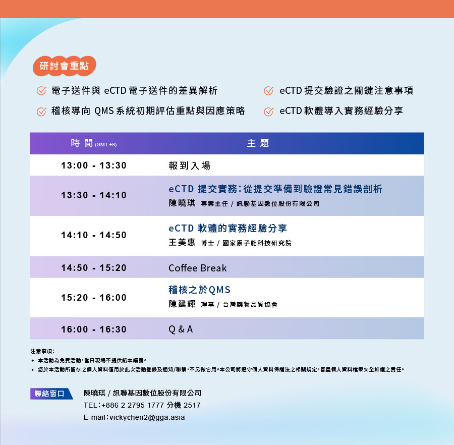 隨著TFDA持續推動數位化與eCTD應用,台灣新藥查驗登記(NDA)將於2027年7月1日起強制採用eCTD3.2格式,正式邁入數位申請新時代。同時,國際間(包含美國、歐洲與亞洲多國等)亦已啟動eCTD4.0的測試與收件作業。在制度轉換與技術升級的過程中,產業仍普遍無法釐清「電子送件」和「eCTD電子送件」本質上的差異,對於eCTD軟體的導入與提交驗證存有疑慮。應用於eCTD提交的QMS,如何將稽核概念納入系統的初期評估中,亦是業者關注之重點。
