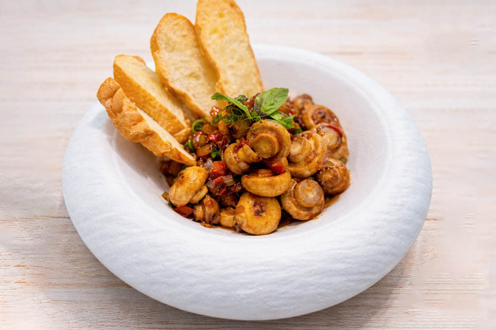 以溫沙拉概念的開胃料理,利用蘑菇耐炒且不易出水的特性,透過簡單拌炒釋放自然鮮味,結合巴薩米克醋的清爽酸香,堆疊出清新又有層次的風味。底部鋪上濃郁滑順的希臘優格,不僅增添柔和奶香,也巧妙平衡醋的酸度,使整體風味更加圓潤,是一道簡單卻細緻的開胃前菜。