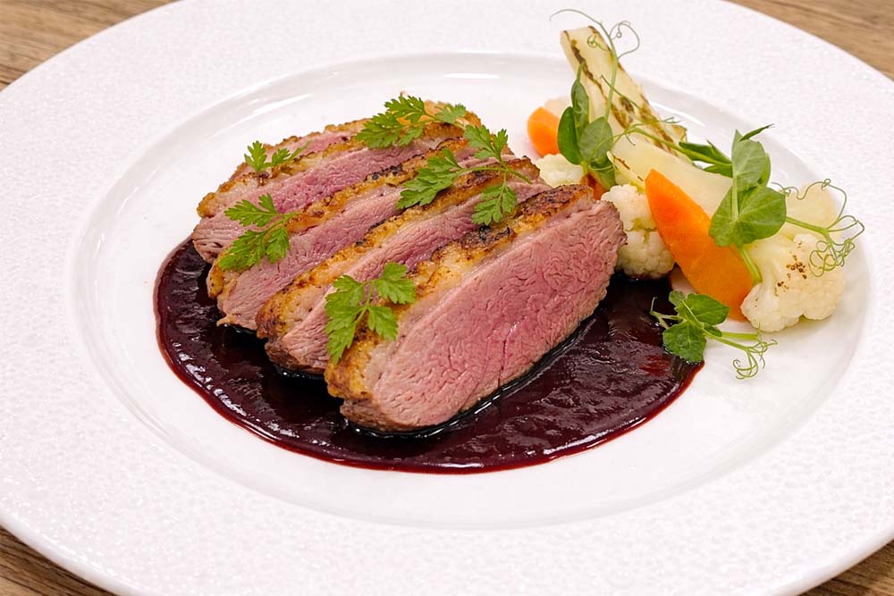 精選法式櫻桃鴨胸,肉色如同櫻桃紅般綻放,肉質鮮嫩扎實,咀嚼起來多汁、甜潤、有彈性,無一般鴨肉的腥味,一口咬下肉香在嘴邊徘迴不已,若用牛排部位作比擬,更享有鴨肉中的菲力美譽。