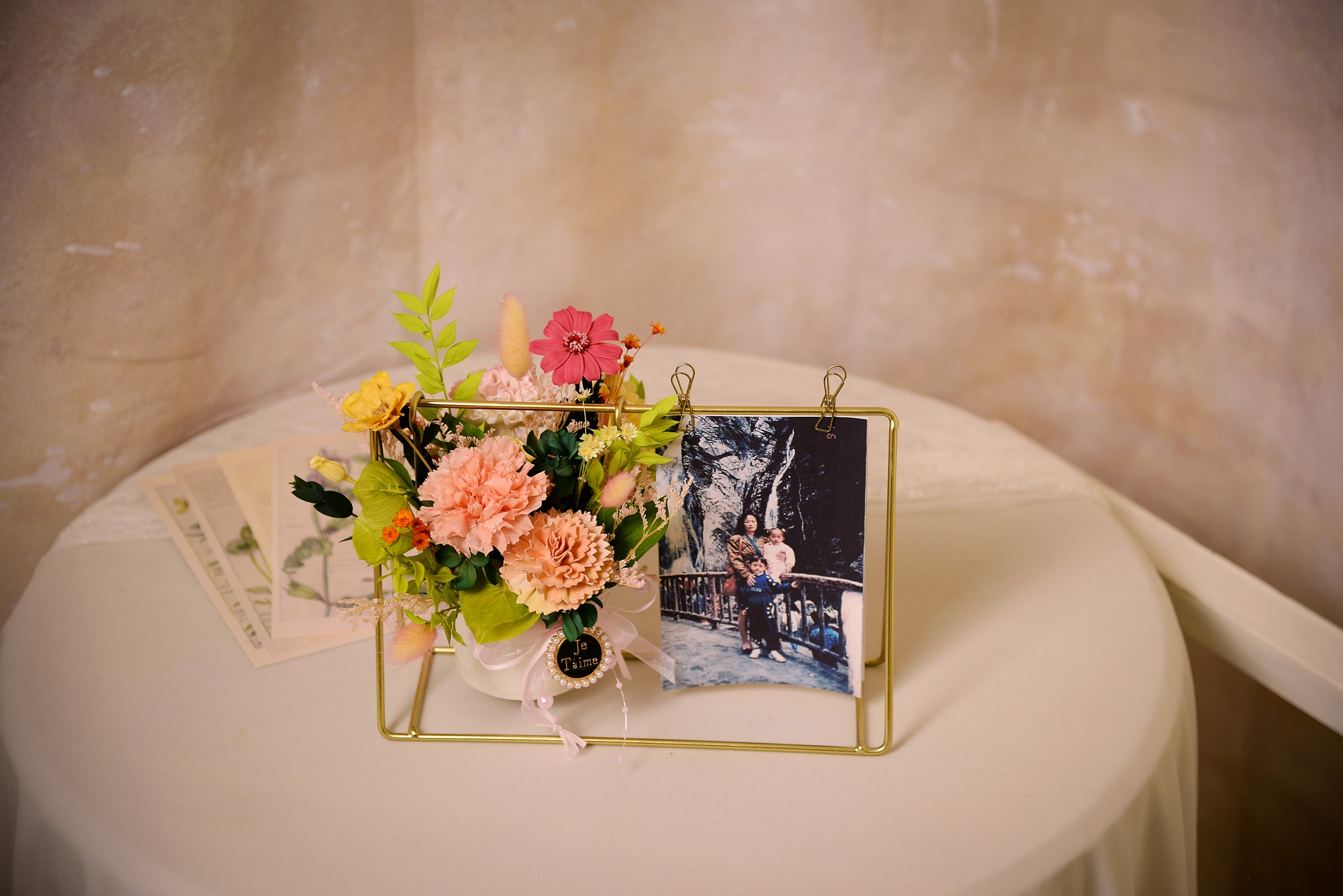 一邊是精心完成的盆花,一邊是夾上美好回憶的照片;