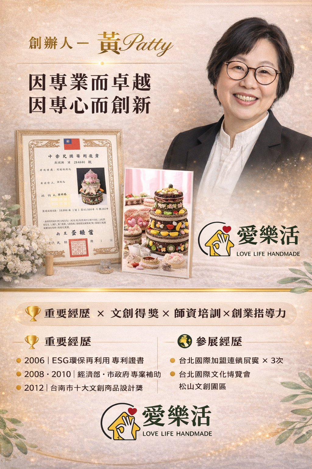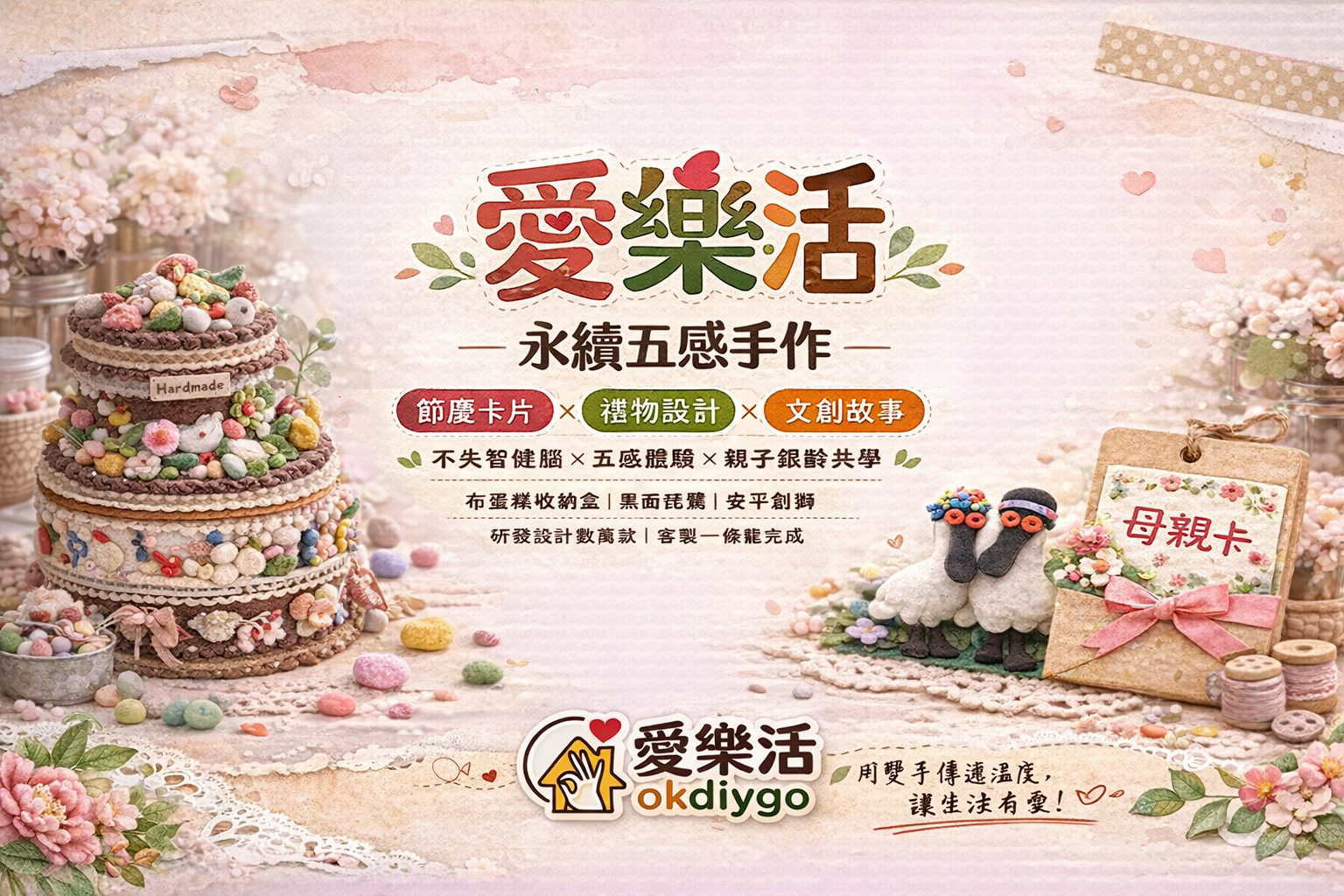 愛樂活長期投入 節慶永續五感手作、親子共學、銀齡共學、教學應用與創意設計,以 ESG環保永續理念、素材再利用、專利文創設計、情感教育 為核心,讓手作不只是完成一件作品,更成為一種結合 五感體驗、創意啟發、情感傳遞與教學應用 的學習方式。