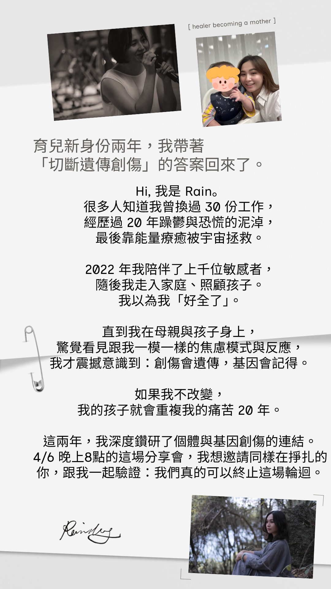 2022 年起,我離開了科技業的高薪工作,被宇宙推著進入療癒之道。這段期間,我陪伴了上千位和我一樣的能量敏感者。這兩年我走入家庭、照顧孩子。我以為我「康復了」。直到我在孩子身上,驚覺看見跟我一模一樣的身心模式與靈能量的反應,我才震撼意識到:創傷會遺傳,基因會記得。