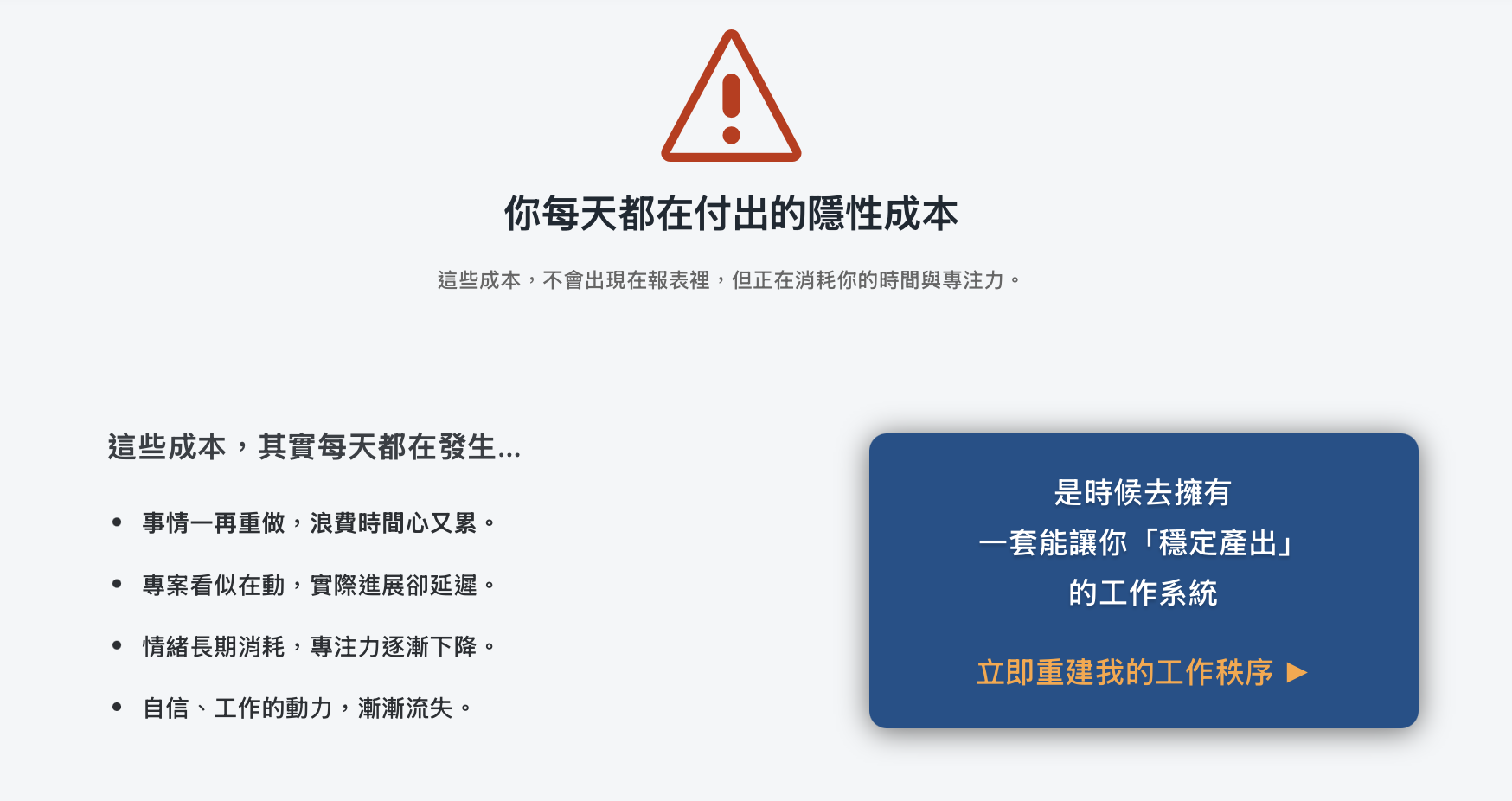 你將學會辨識效率失控的根源,建立三階段效率重建藍圖,理解為什麼時間管理總是做了卻沒效果,並重新設計你的個人工作系統方向。