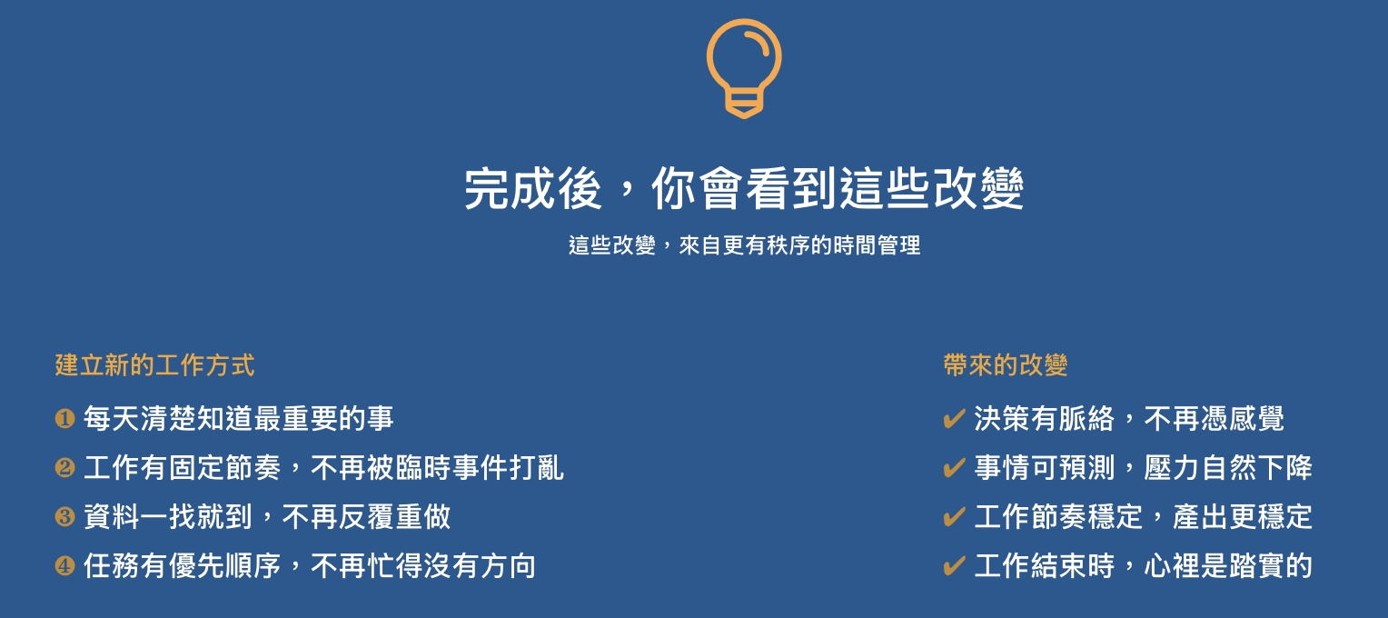 你將理解為什麼許多時間管理方法無法長期有效,並重新看懂工作效率背後真正的運作邏輯,透過本課程能夠逐步建立屬於自己的個人工作管理系統。