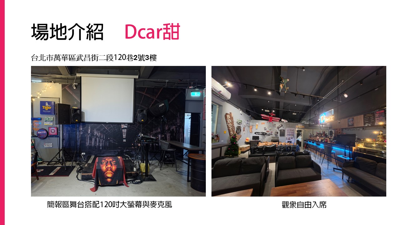 地點:Dcar甜 108臺北市萬華區武昌街二段120巷2號3樓