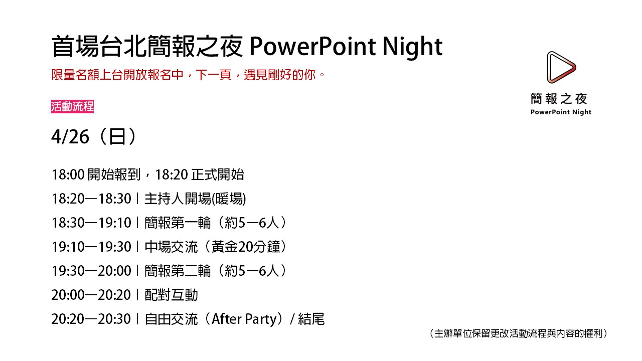 每位上台者用3分鐘、3~5頁投影片介紹自己,分享優缺點、生活與最近關注的事,讓你不再留在網路交友,而是快速理解一個人。