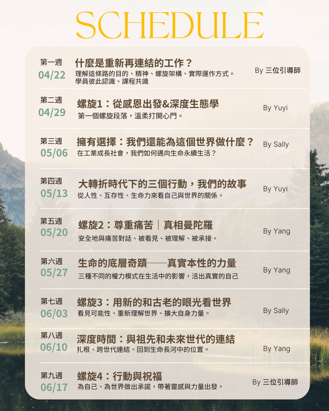 但在快速運轉的生活中,這些細緻的聲音往往被淹沒。本次線上聚會,將以三位引導師的生命故事為起點,邀請你一起看見:「生命再連結」如何在真實日常裡成為溫柔且有力的轉化。