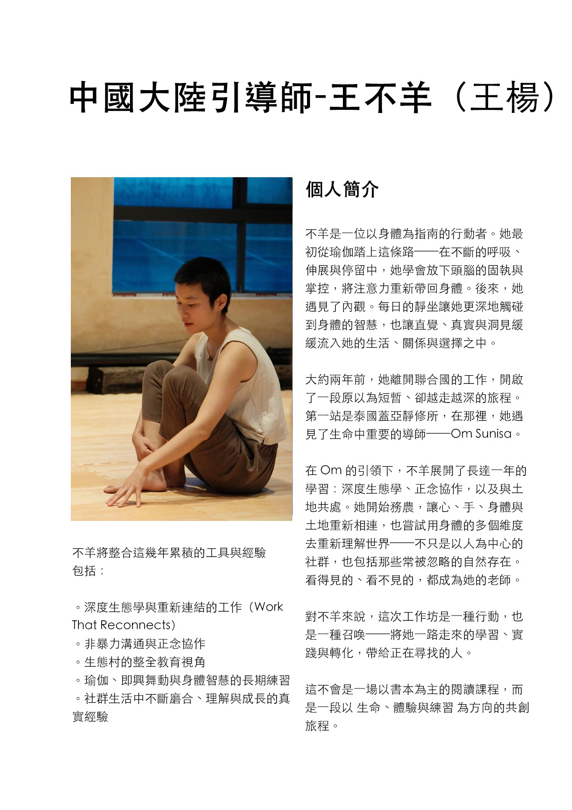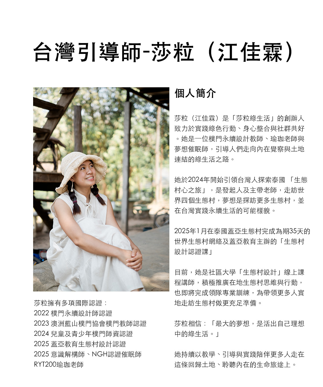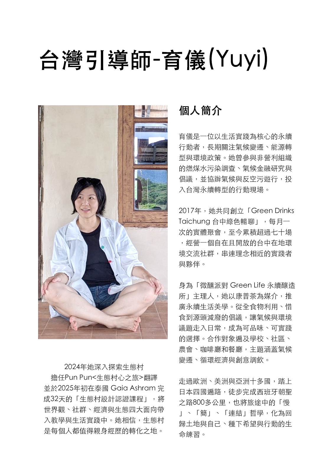 三位皆曾在泰北 Gaia Ashram 蓋亞生態村 深度學習、完成32天生態村設計認證,也共同受到深度生態學與蓋亞教育的啟發。她們將從各自的生命旅程分享: