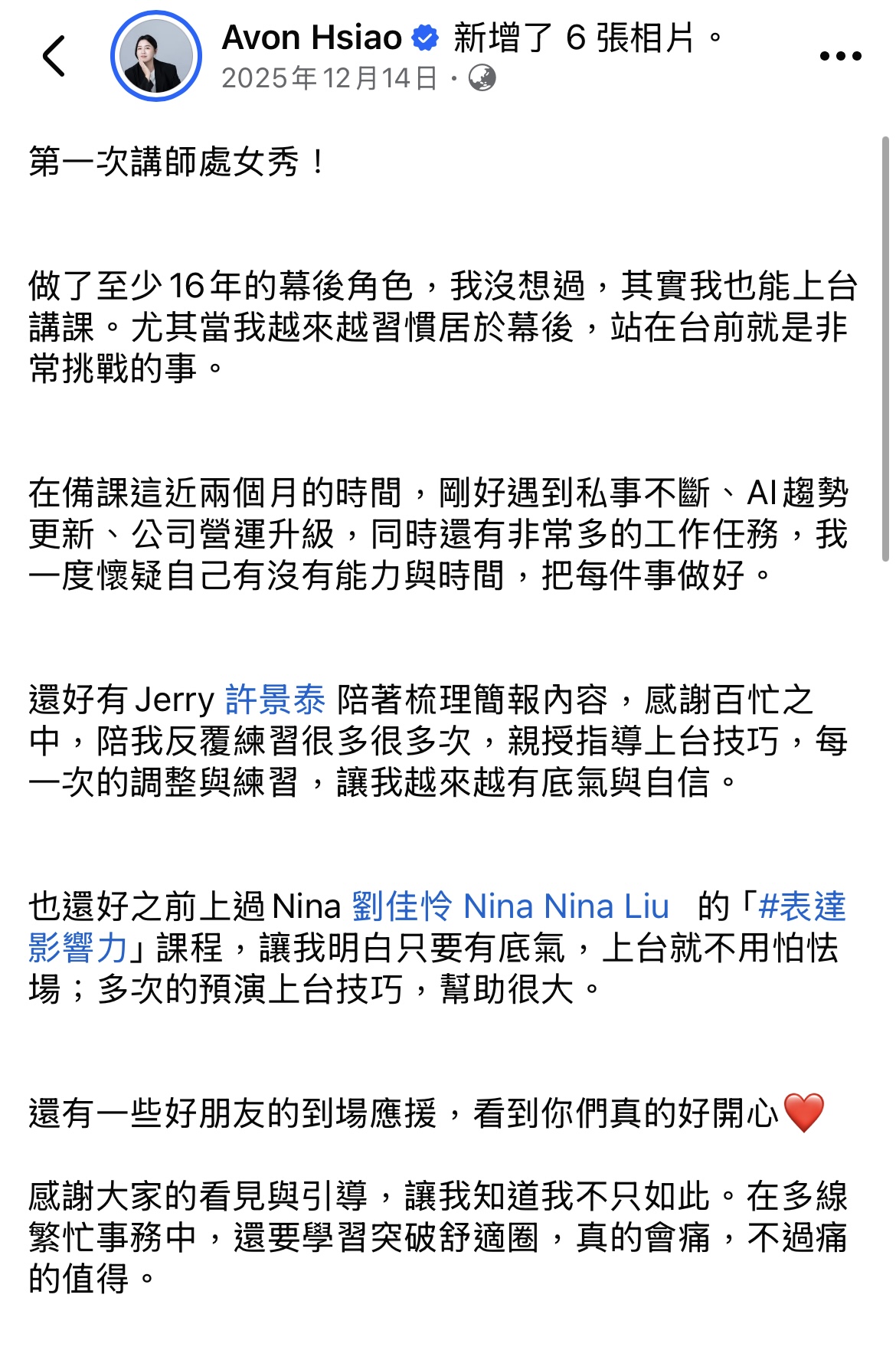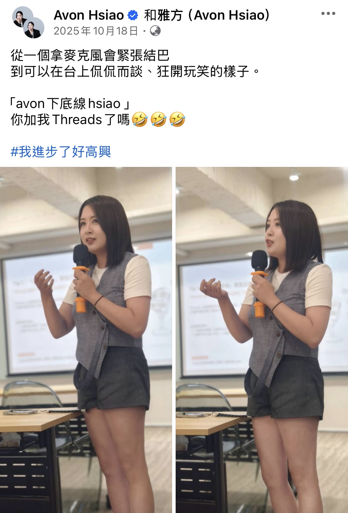 「從拿麥克風會緊張結巴,到可以在台上侃侃而談、狂開玩笑。」