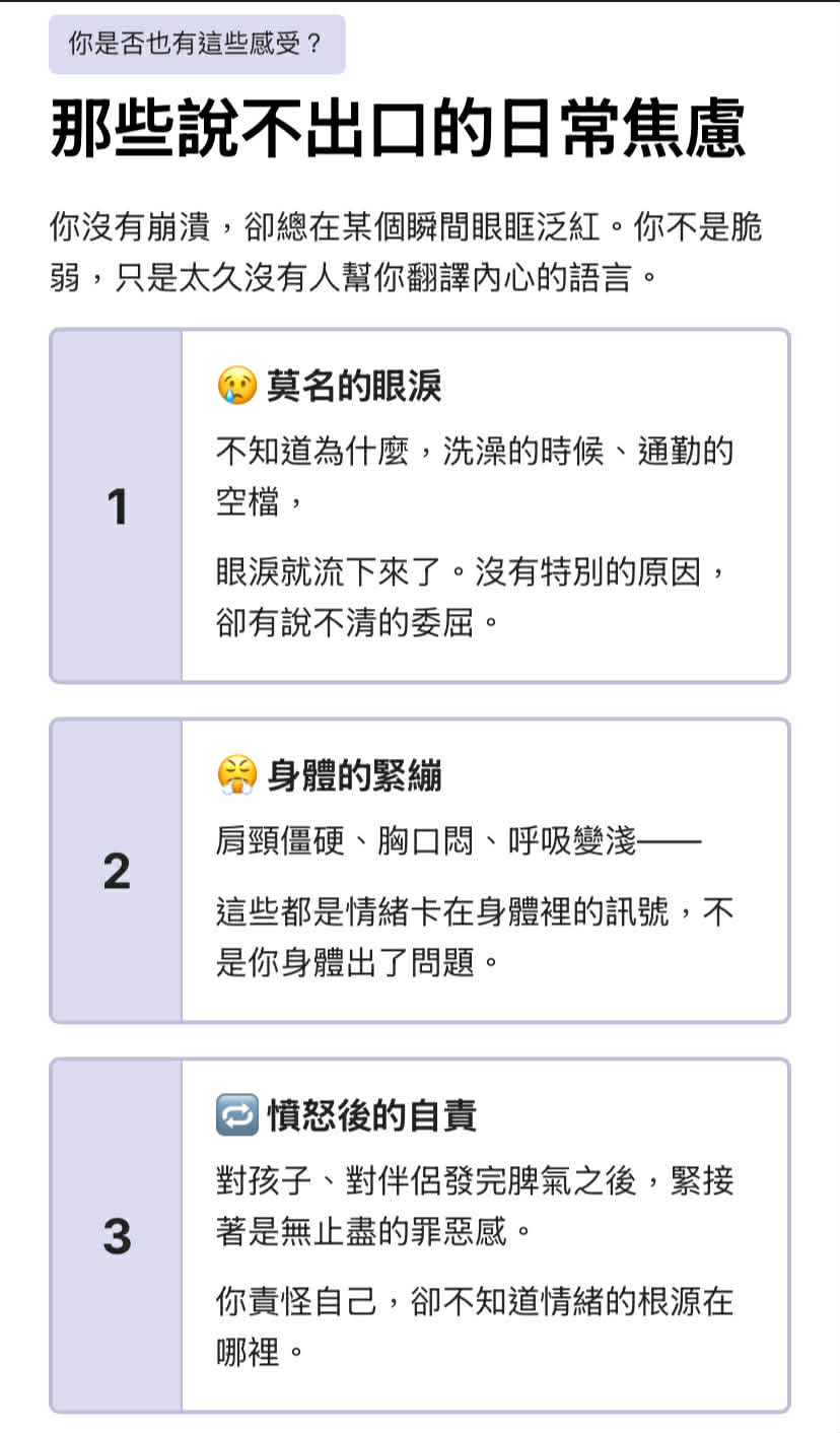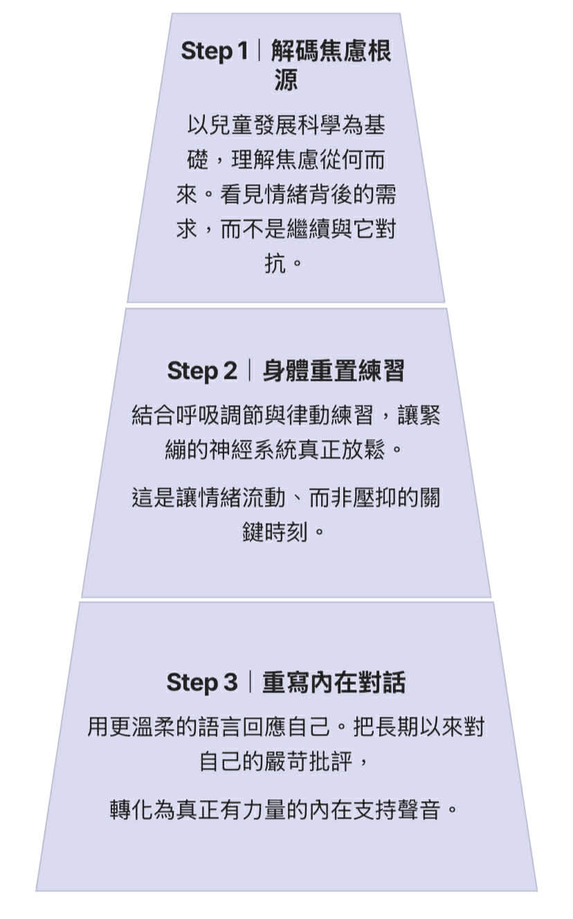 3. 【日常練習】:帶走一套「情緒翻譯工具」,在下次焦慮來襲時,能溫柔地接住自己。