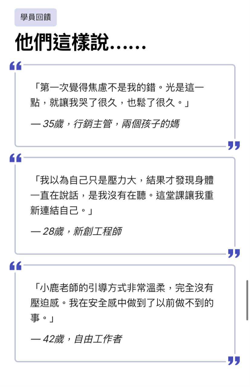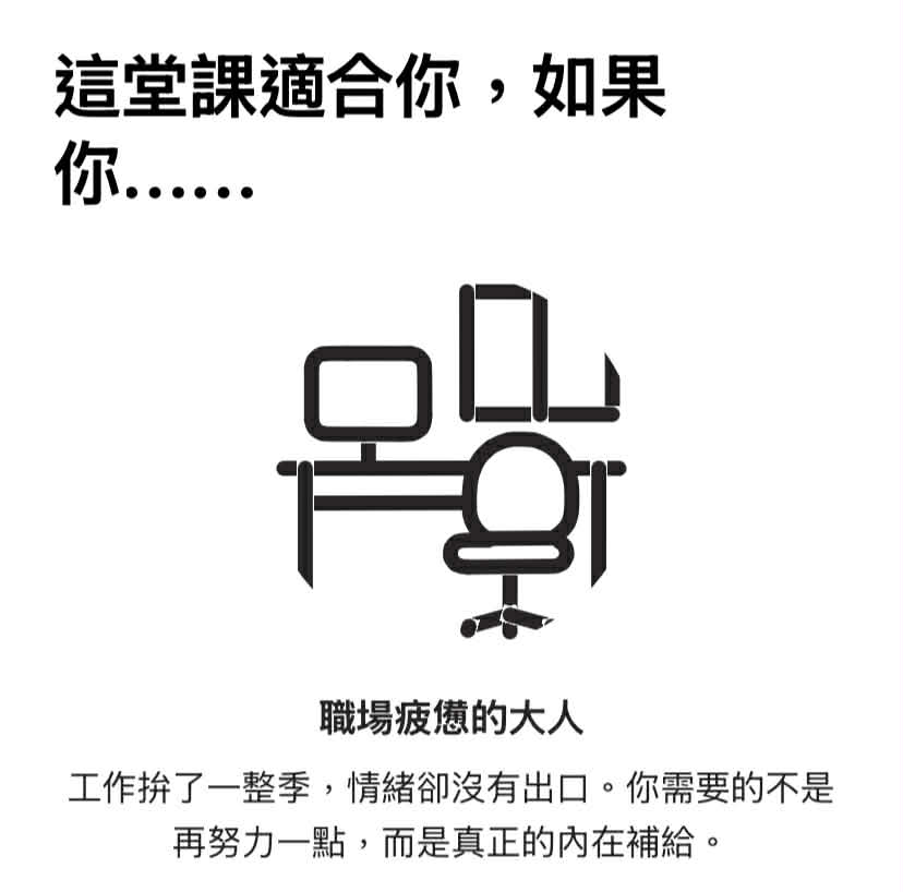• 本課程內容無法取代醫療建議、診斷或治療。如有發現需求,請尋找專業的心理輔導和治療,將能幫助你處理並找到適合您的應對方式。