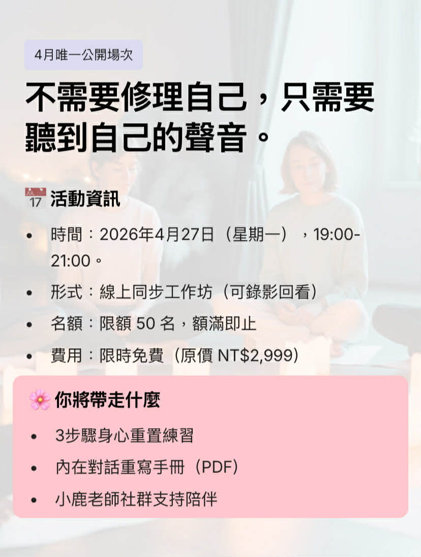 【4月限時免費票開放中!】小鹿老師(楊惠如)帶你透過「兒童發展科學」與十年萬人實務經驗,開啟一場與內在小孩溫柔對話的調頻練習。這不是枯燥的理論,而是能帶回生活的「情緒翻譯工具」,陪你化解莫名焦慮,讀懂身體與壓力背後的深層需求,體驗一場關於「安全感」的重塑之旅。