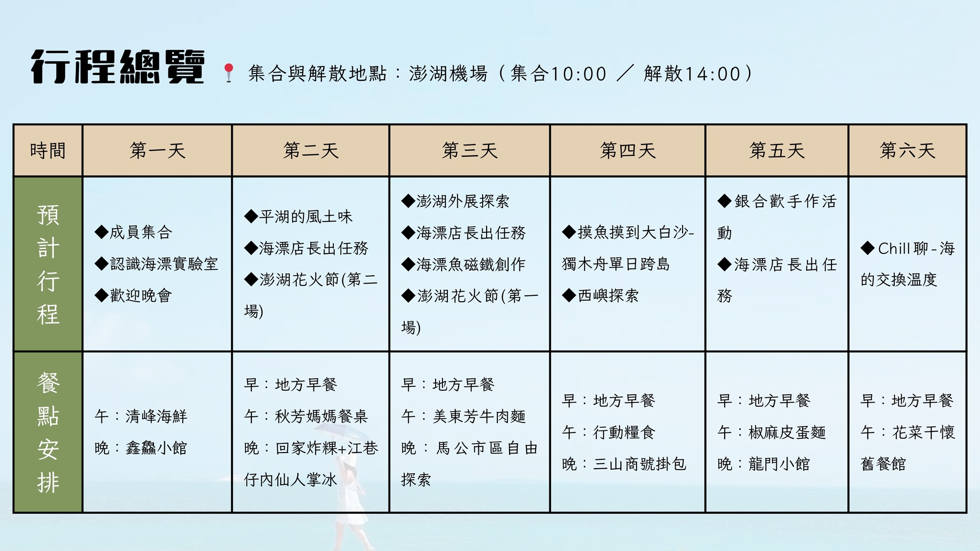 第一天集合時間為上午10:00,第六天解散時間為下午14:00,地點皆為澎湖機場。