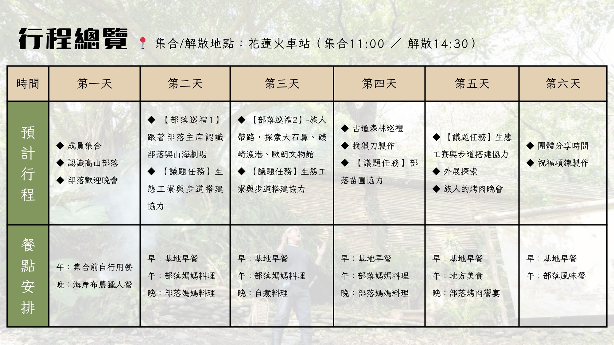 第一天集合時間為上午11:00,第六天解散時間為下午14:30,地點皆為花蓮火車站。