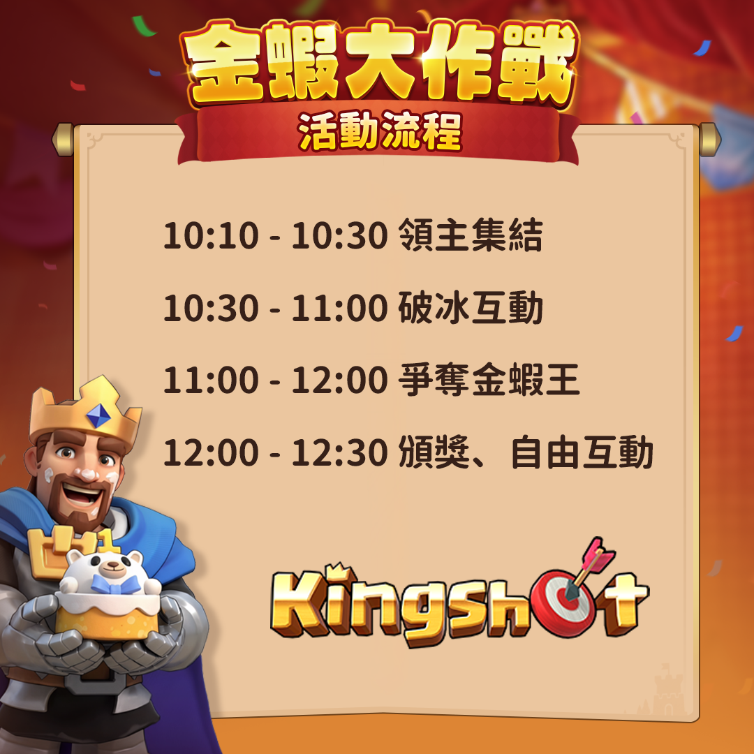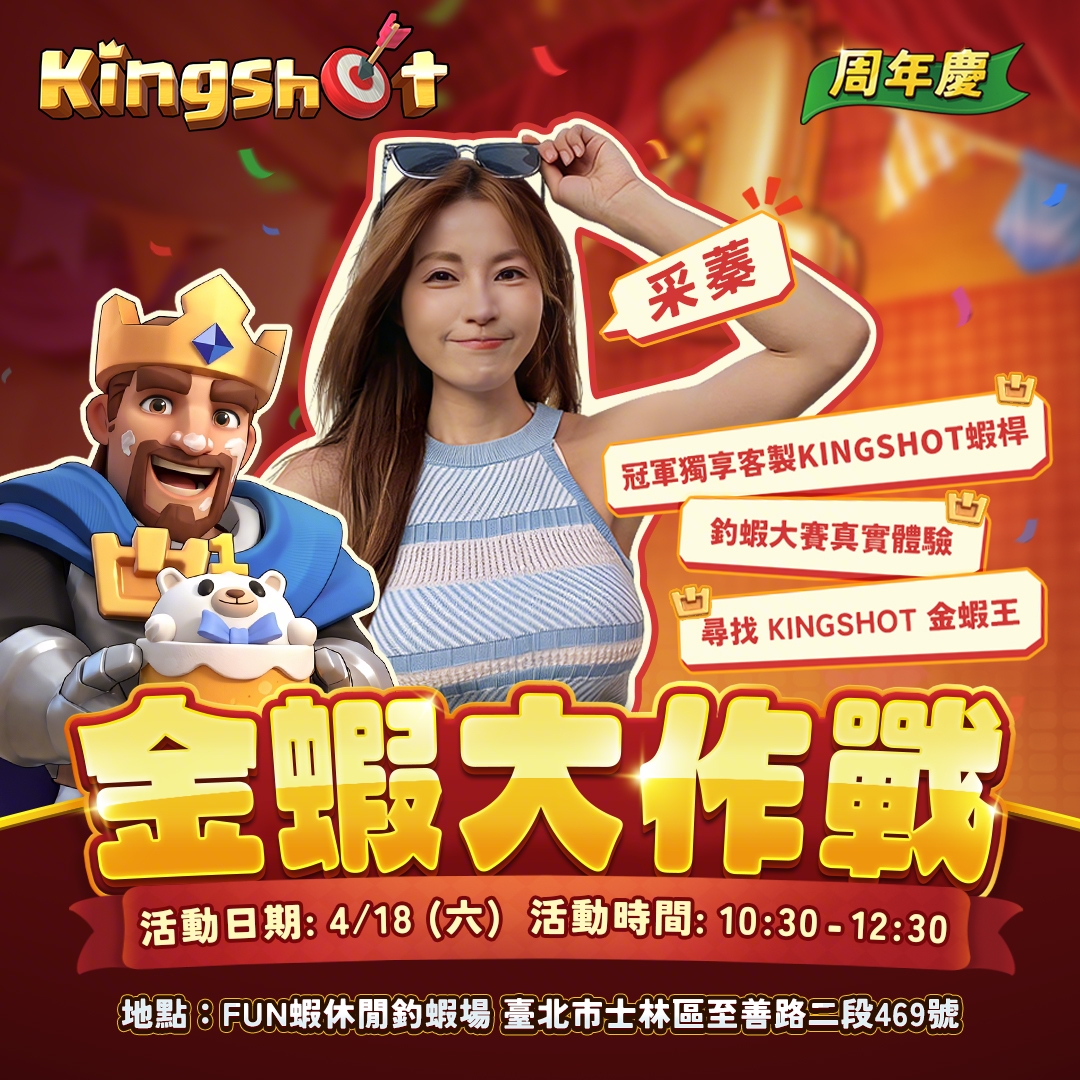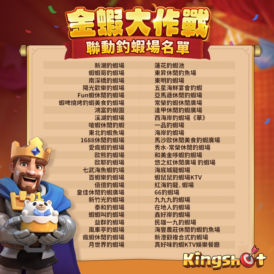 本次聯動將於 2026 年 4 月 17 日 ~ 5 月 17 日,攜手全台 50 家釣蝦場火熱展開!在《Kingshot》一周年尾聲,來場最接地氣、最有爽感的王國慶典 🎯