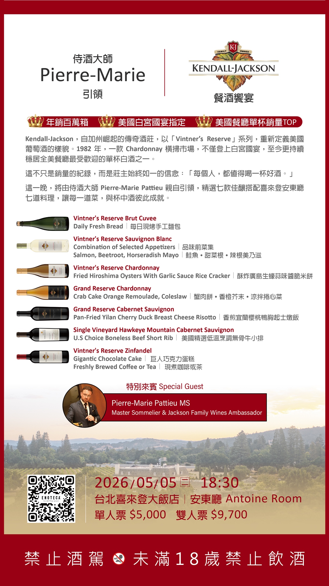 ※ 本活動為座席式餐酒會,依現場情形有可能與他人併桌。酒款數量依現場提供為主。