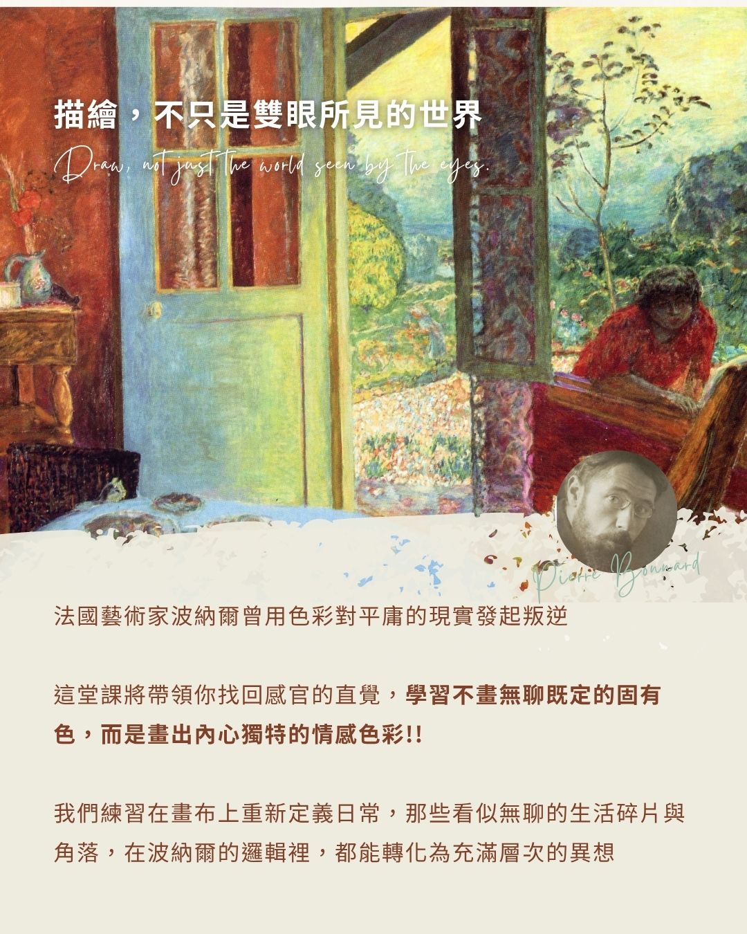 我們練習在畫布上重新定義日常,那些看似無聊的生活碎片與角落,在波納爾的邏輯裡,都能轉化為充滿層次的異想。