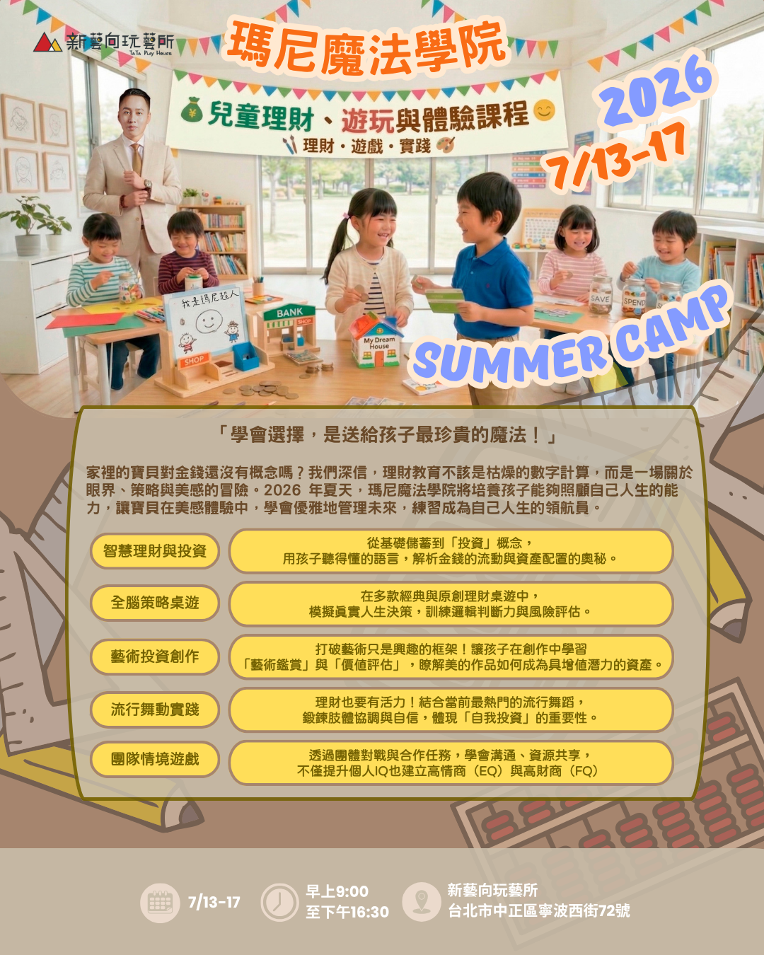 2026 年夏天,瑪尼魔法學院將培養孩子能夠照顧自己人生的能力,讓寶貝在美感體驗中,學會優雅地管理未來,練習成為自己人生的領航員。