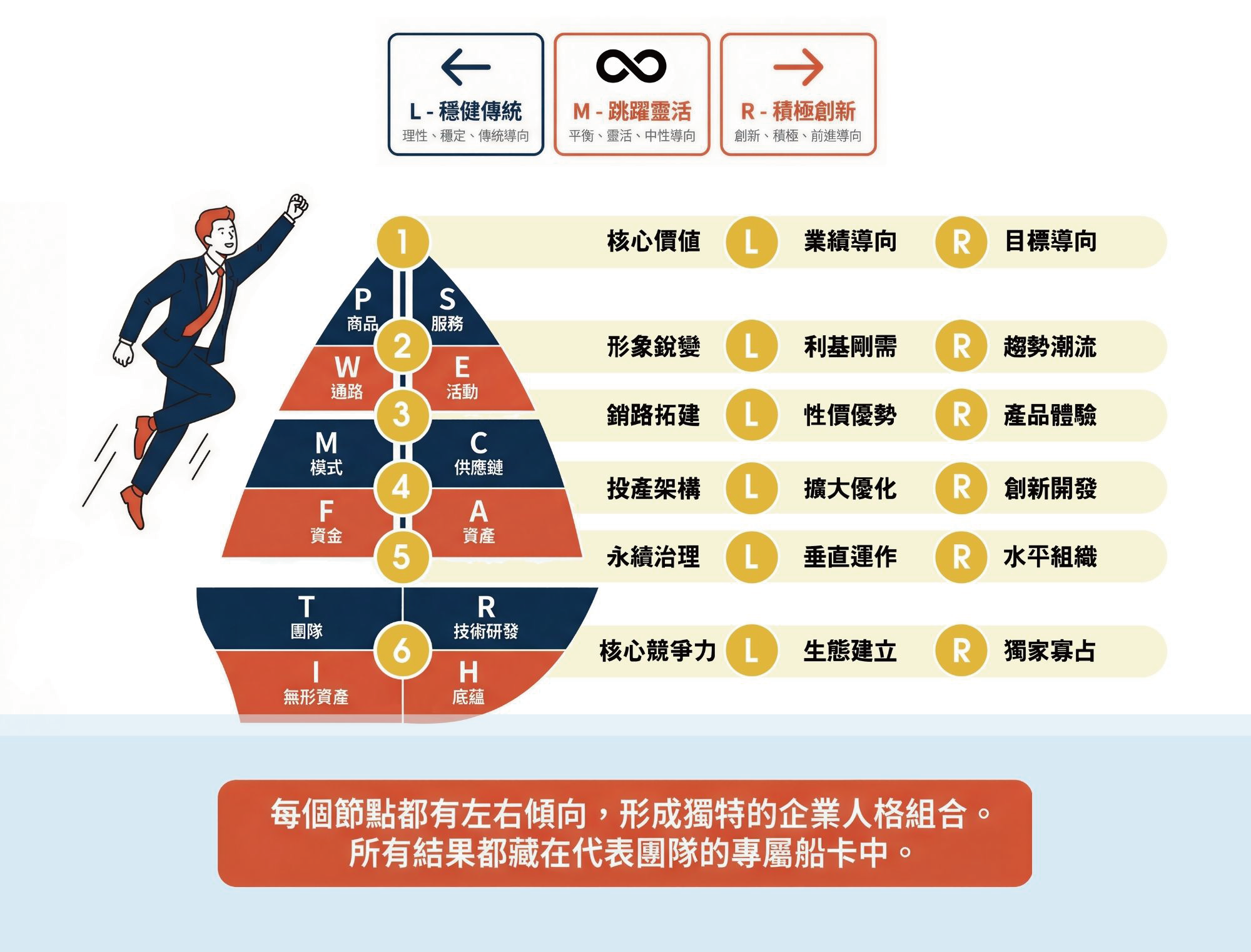 - 左中右三大陣營(L種健傳統、M跳躍靈活、R積極創新)