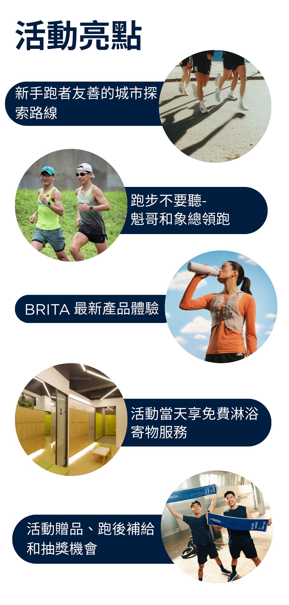 邀請跑者一起和「跑步不要聽」同歡,一起歡慶世界跑步日, 享受跑步帶來的自由與陪伴。本場活動特別歡迎新手跑者,透過輕鬆的配速與社交跑形式,一邊漫遊永康街區,讓每個人都能完成自己的跑步里程碑。活動中還可享受純淨與安心的 BRITA 好水,讓我狀態超好!