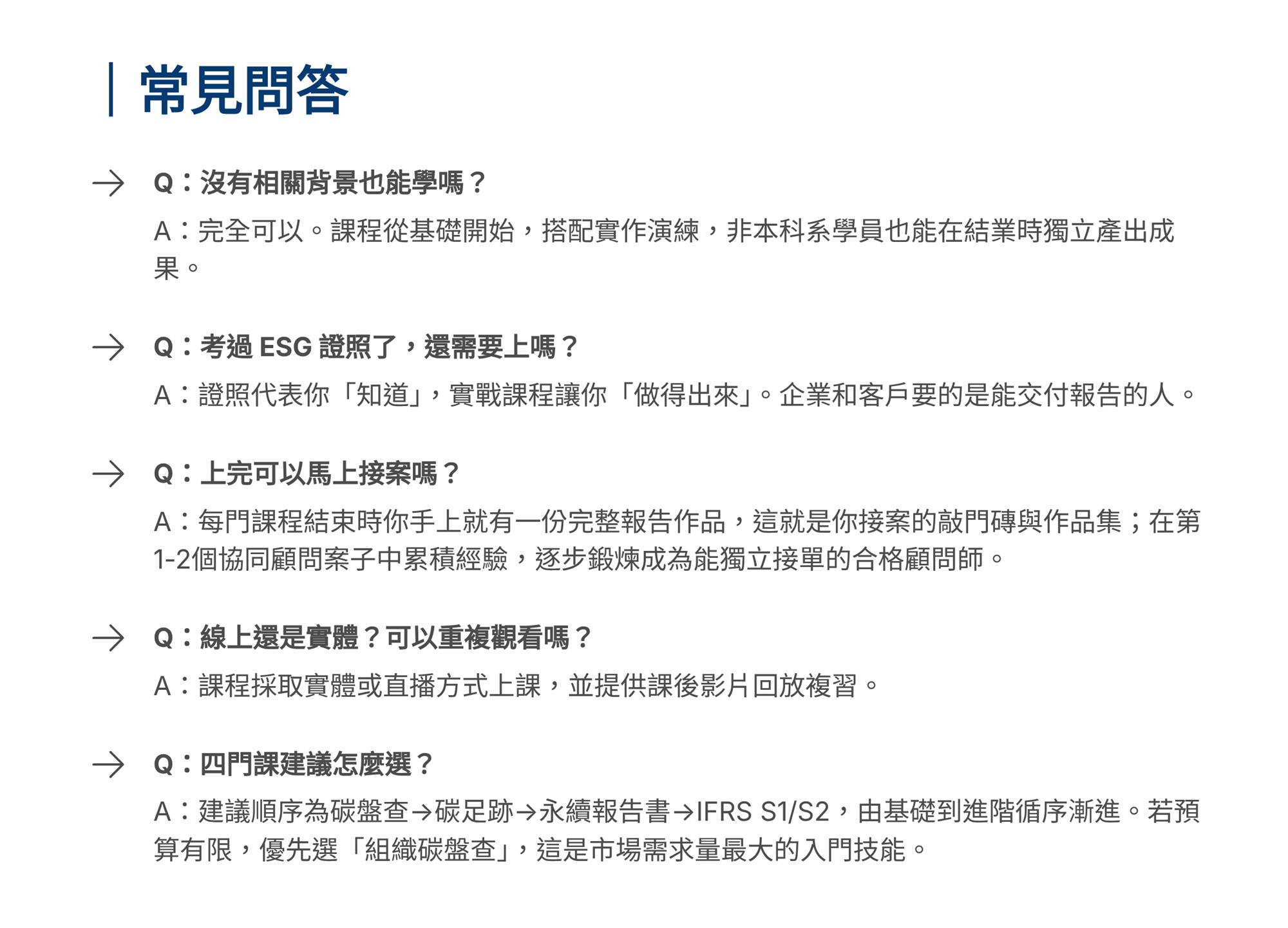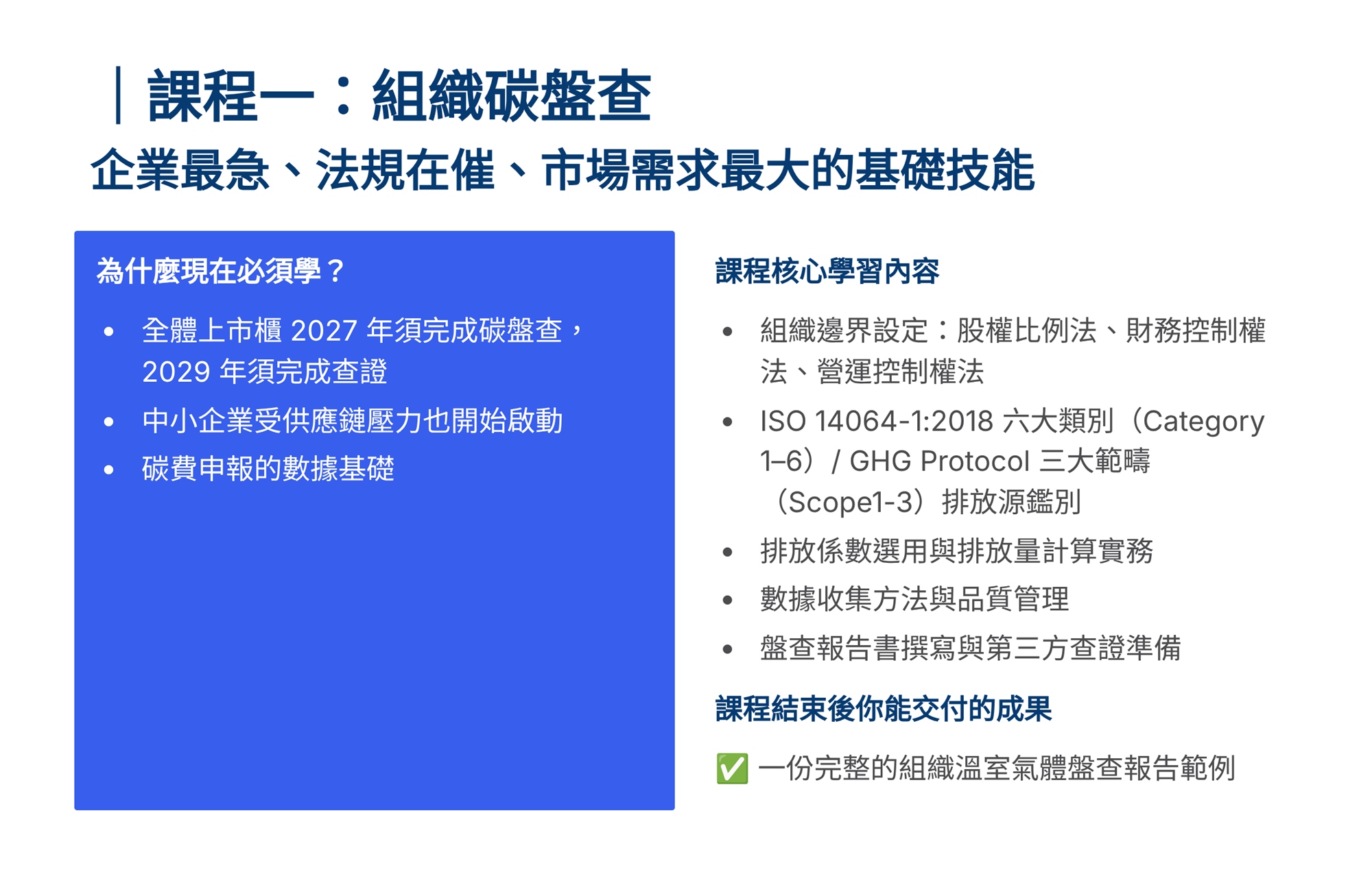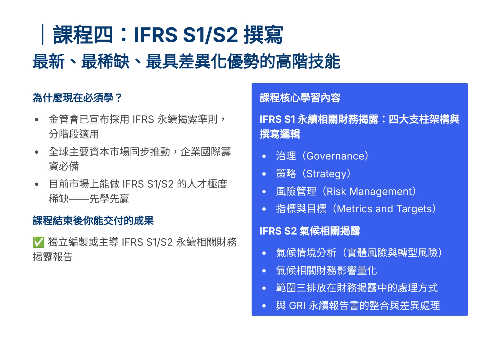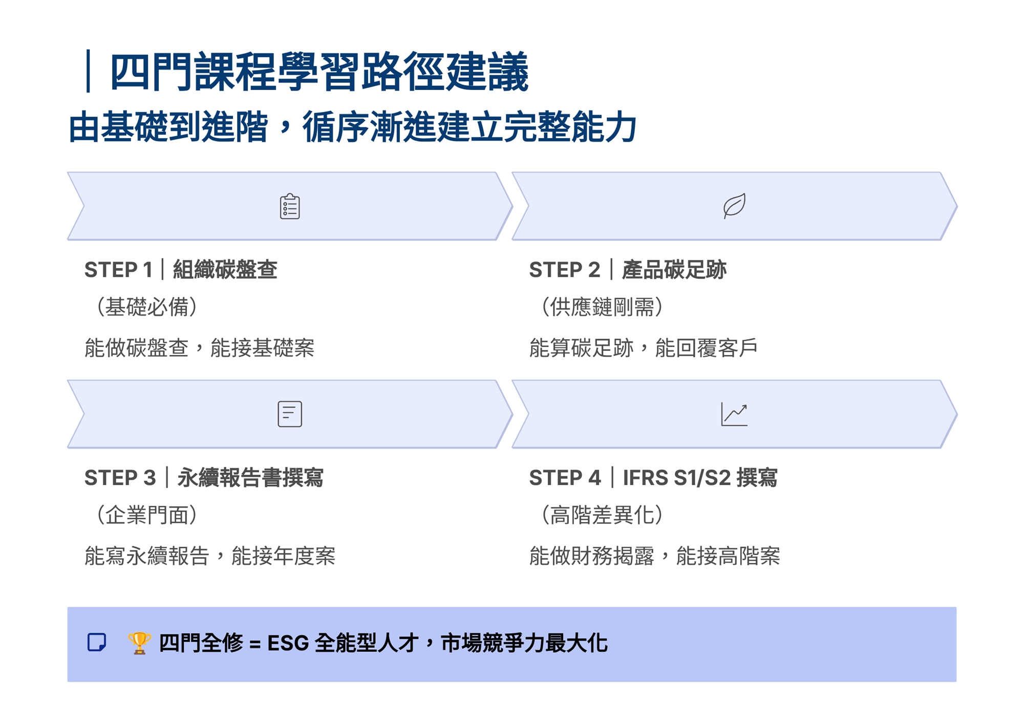 S學院精心設計ESG四大實戰課程,協助企業從碳管理到資訊揭露一次到位。 「組織碳盤查」課程帶領學員掌握ISO 14064-1框架,建立完整盤查能力。「產品碳足跡」課程聚焦ISO 14067標準,學習全生命週期評估方法。「永續報告書撰寫」課程依循GRI準則,重大性主題鑑別、利害關係人溝通及報告書架構編撰實務。「IFRS S1/S2撰寫」課程則對接國際永續揭露準則,協助企業掌握氣候相關財務揭露與永續資訊申報要求。 四門課程由淺入深、環環相扣,結合案例演練與實作產出,為企業打造即學即用的ESG實戰力。