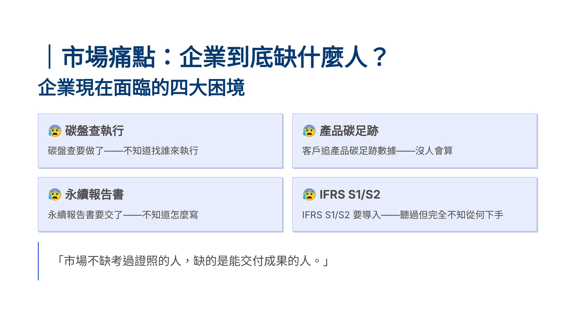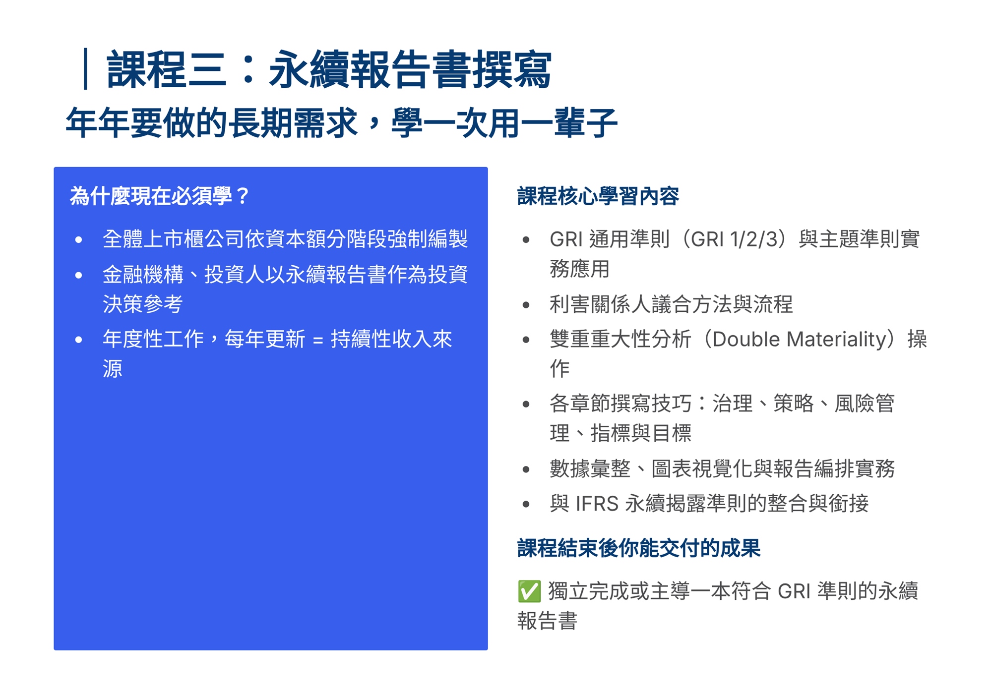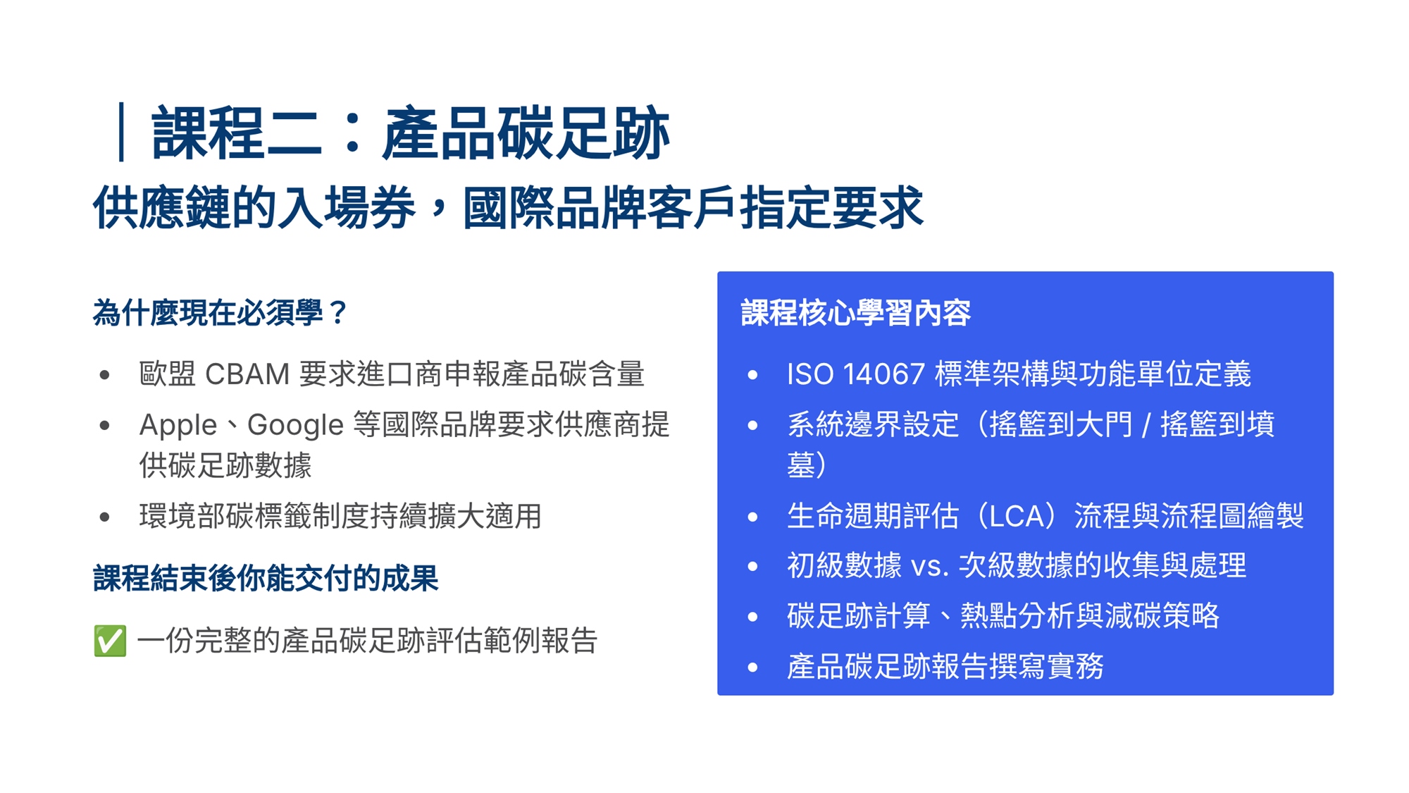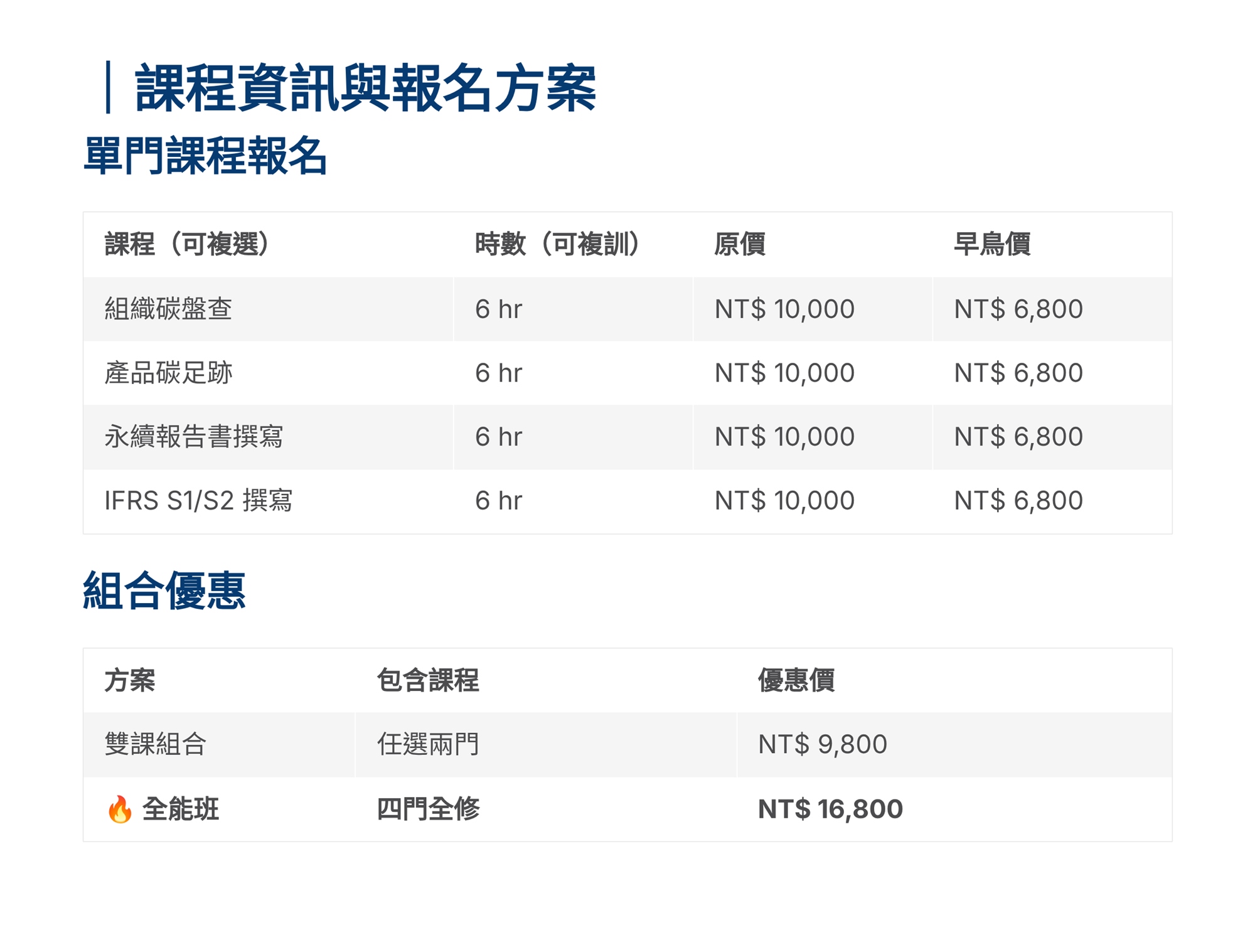 S學院精心設計ESG四大實戰課程,協助企業從碳管理到資訊揭露一次到位。 「組織碳盤查」課程帶領學員掌握ISO 14064-1框架,建立完整盤查能力。「產品碳足跡」課程聚焦ISO 14067標準,學習全生命週期評估方法。「永續報告書撰寫」課程依循GRI準則,重大性主題鑑別、利害關係人溝通及報告書架構編撰實務。「IFRS S1/S2撰寫」課程則對接國際永續揭露準則,協助企業掌握氣候相關財務揭露與永續資訊申報要求。 四門課程由淺入深、環環相扣,結合案例演練與實作產出,為企業打造即學即用的ESG實戰力。