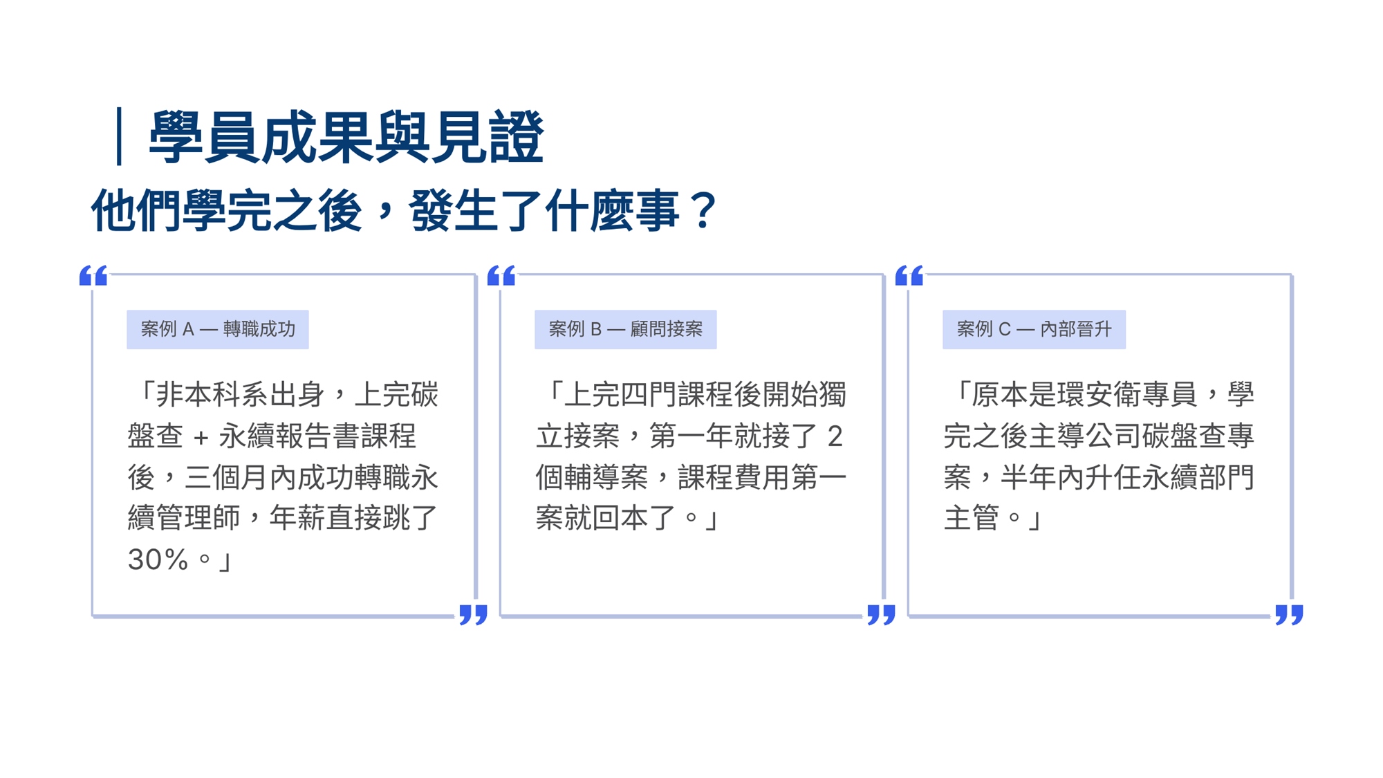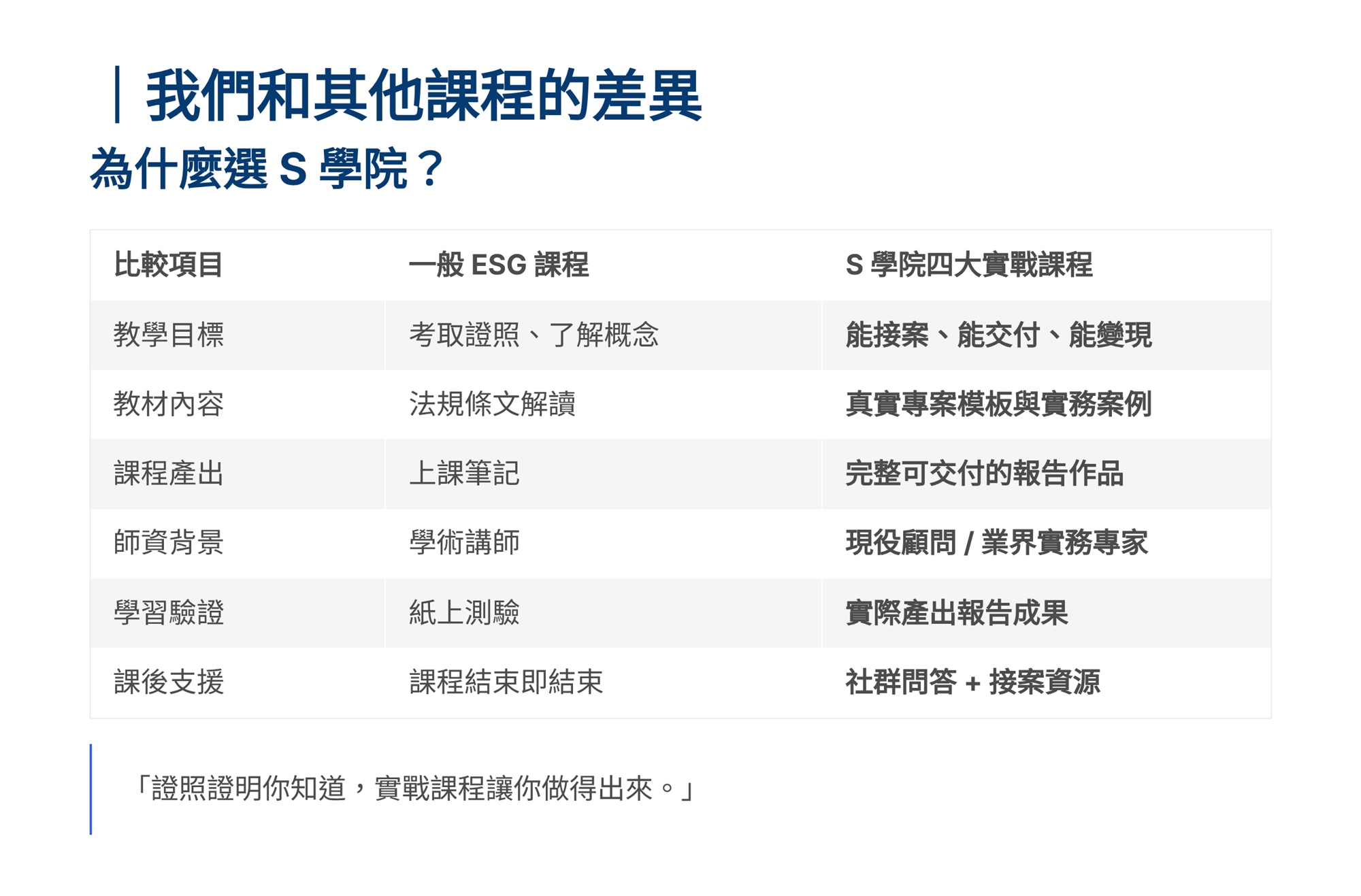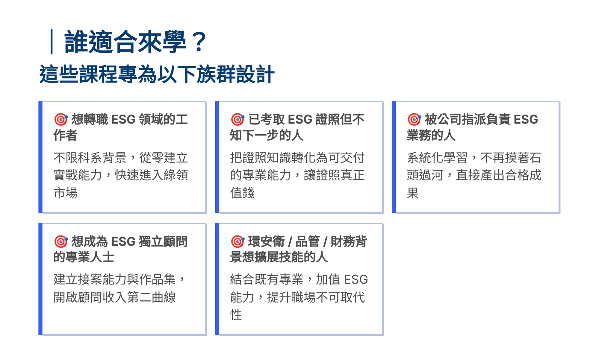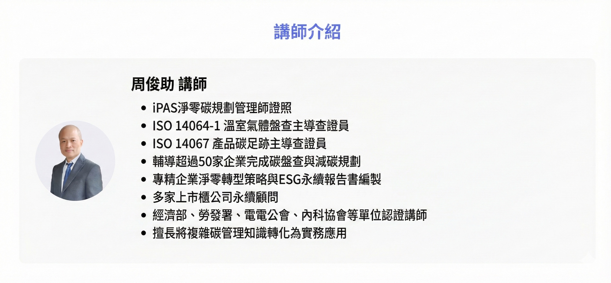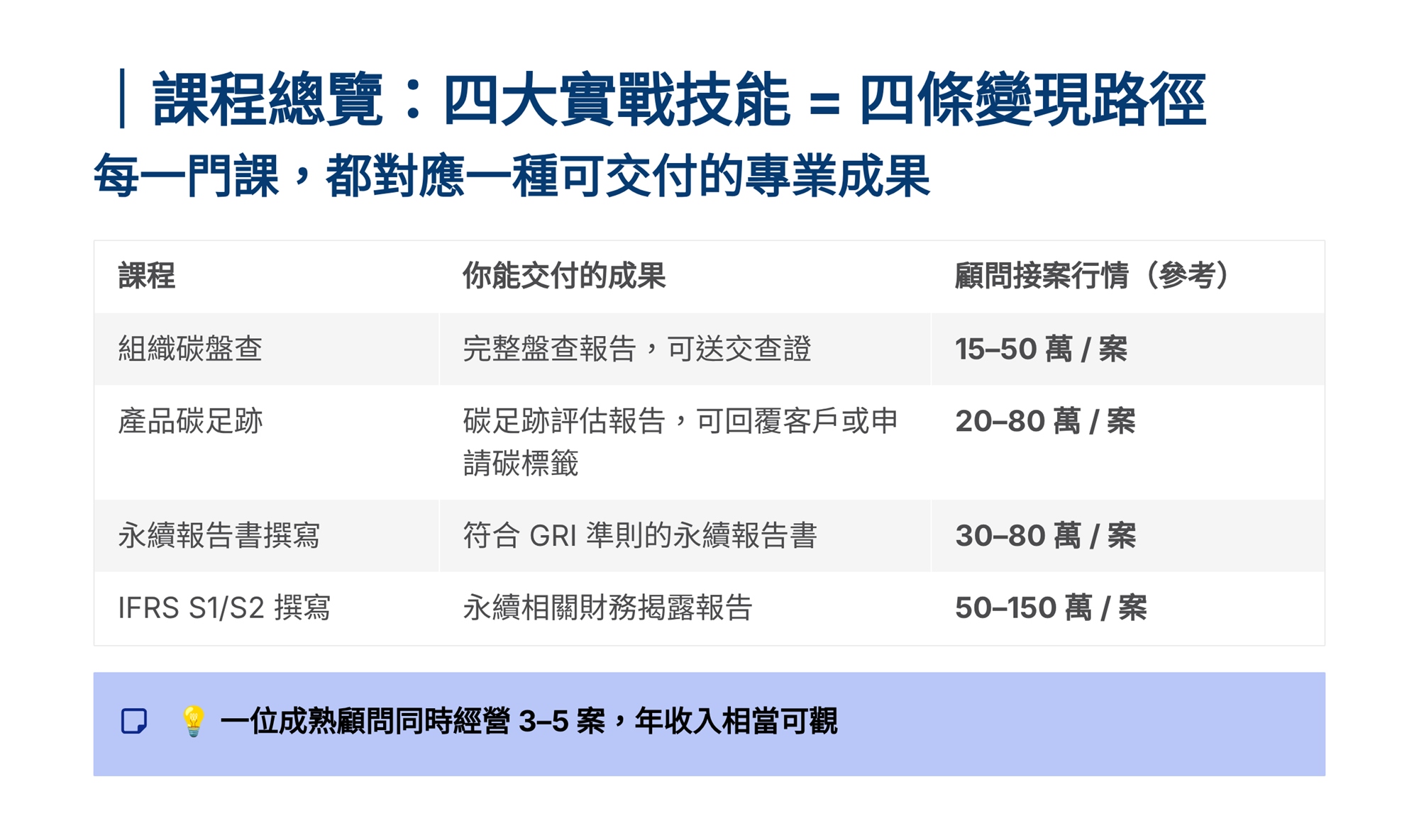 S學院精心設計ESG四大實戰課程,協助企業從碳管理到資訊揭露一次到位。 「組織碳盤查」課程帶領學員掌握ISO 14064-1框架,建立完整盤查能力。「產品碳足跡」課程聚焦ISO 14067標準,學習全生命週期評估方法。「永續報告書撰寫」課程依循GRI準則,重大性主題鑑別、利害關係人溝通及報告書架構編撰實務。「IFRS S1/S2撰寫」課程則對接國際永續揭露準則,協助企業掌握氣候相關財務揭露與永續資訊申報要求。 四門課程由淺入深、環環相扣,結合案例演練與實作產出,為企業打造即學即用的ESG實戰力。