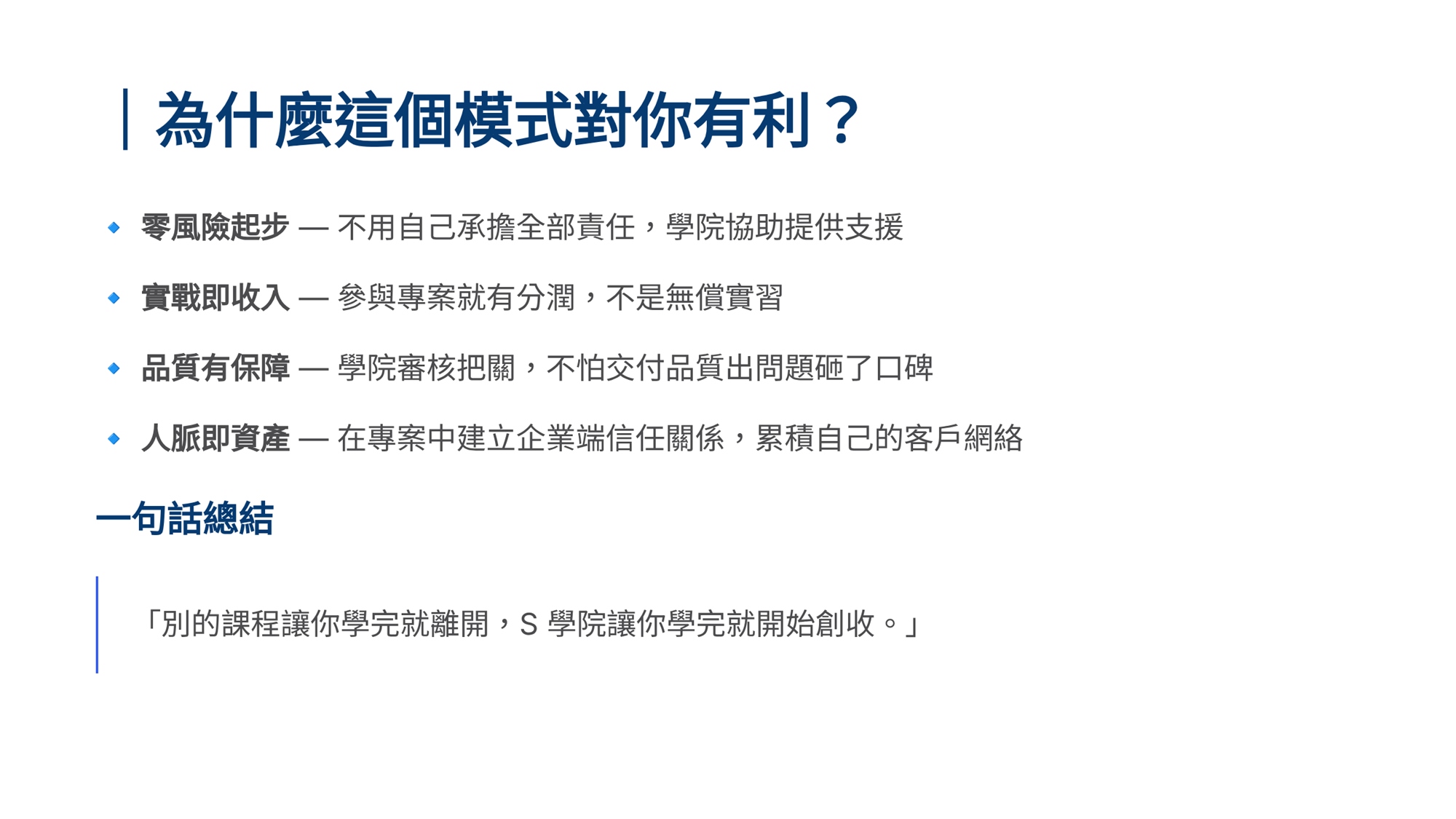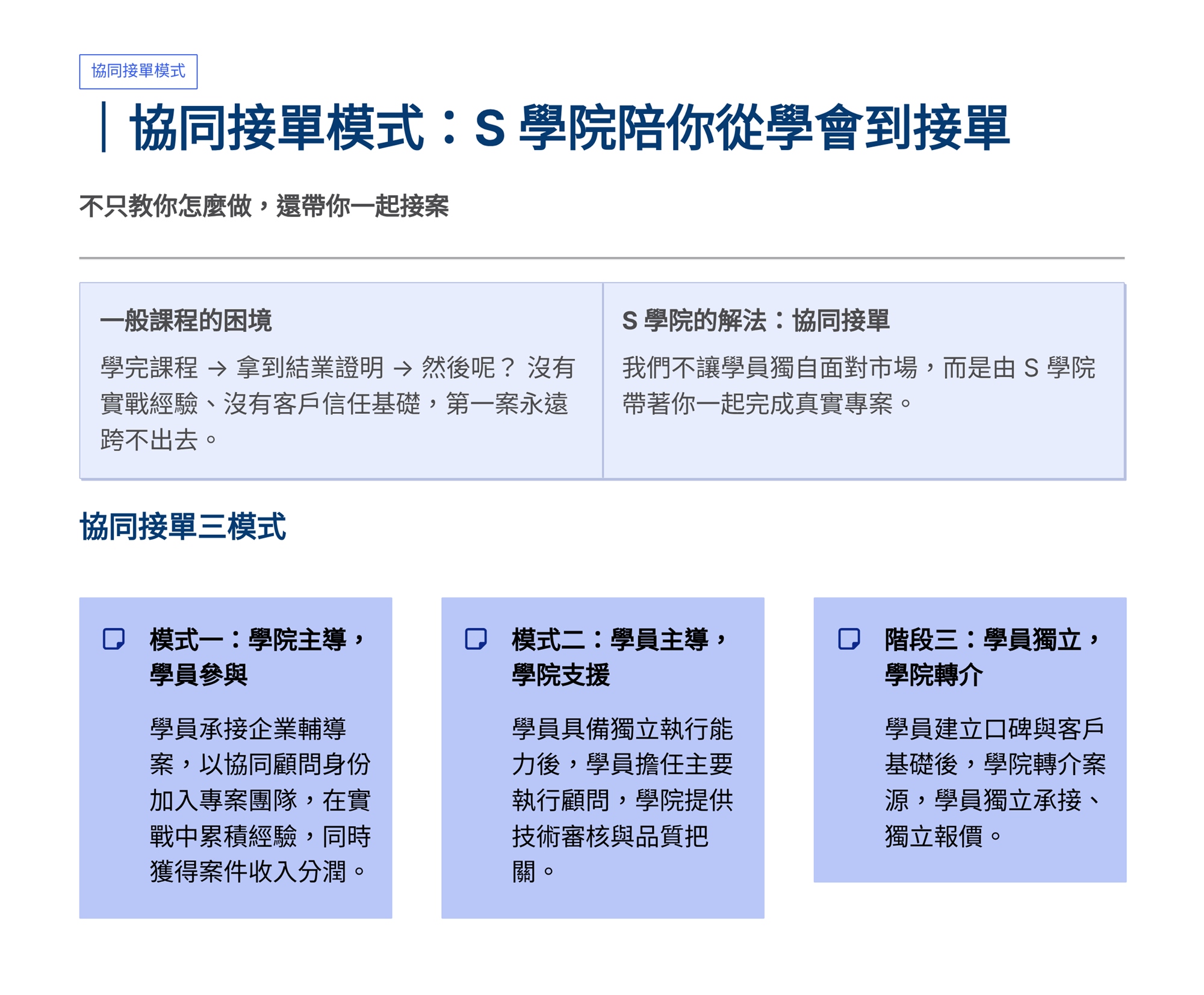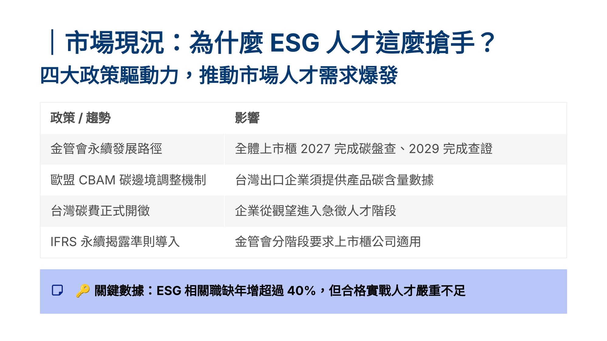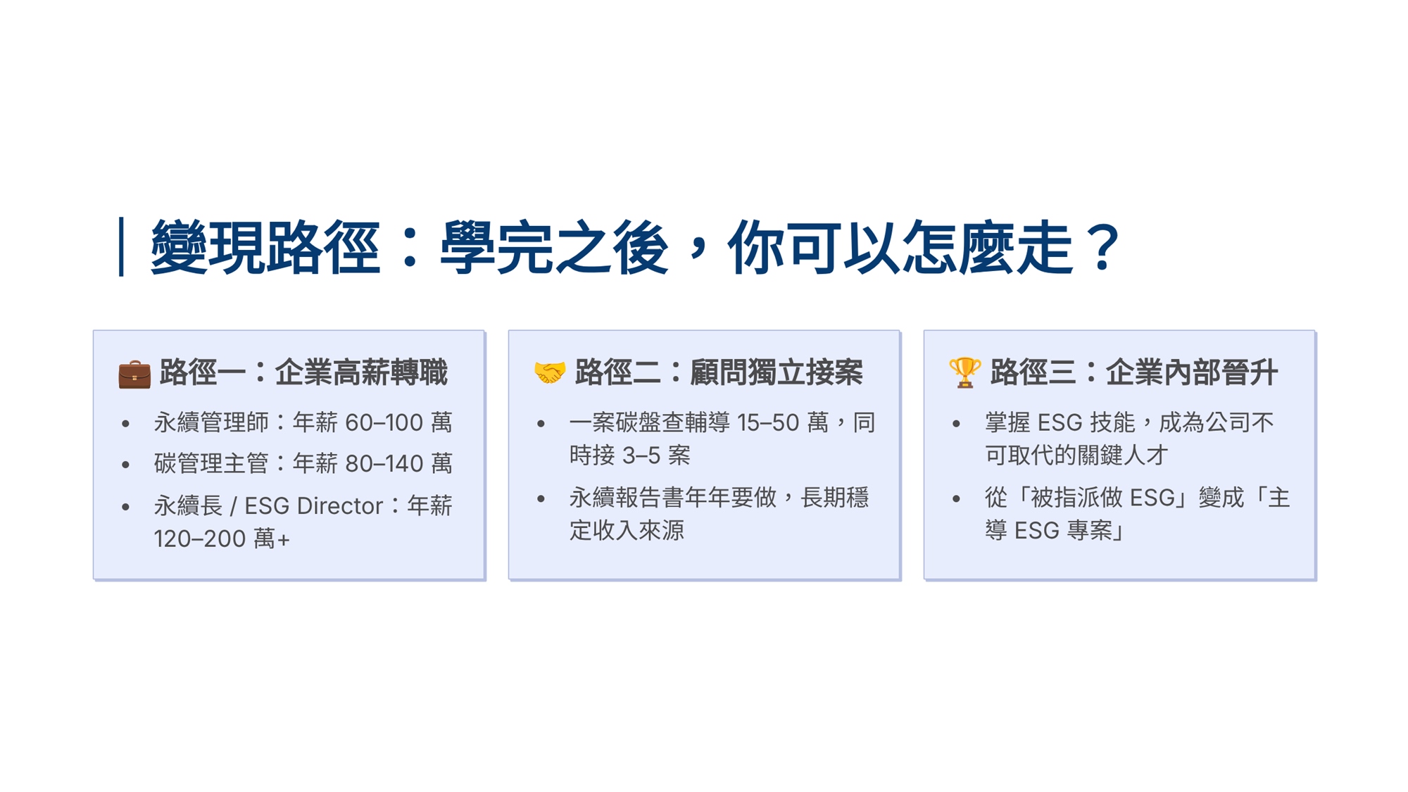 S學院精心設計ESG四大實戰課程,協助企業從碳管理到資訊揭露一次到位。 「組織碳盤查」課程帶領學員掌握ISO 14064-1框架,建立完整盤查能力。「產品碳足跡」課程聚焦ISO 14067標準,學習全生命週期評估方法。「永續報告書撰寫」課程依循GRI準則,重大性主題鑑別、利害關係人溝通及報告書架構編撰實務。「IFRS S1/S2撰寫」課程則對接國際永續揭露準則,協助企業掌握氣候相關財務揭露與永續資訊申報要求。 四門課程由淺入深、環環相扣,結合案例演練與實作產出,為企業打造即學即用的ESG實戰力。