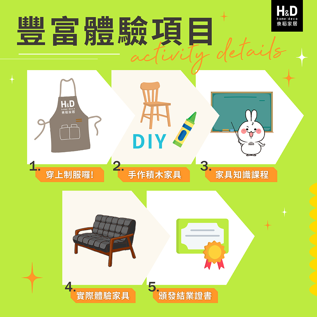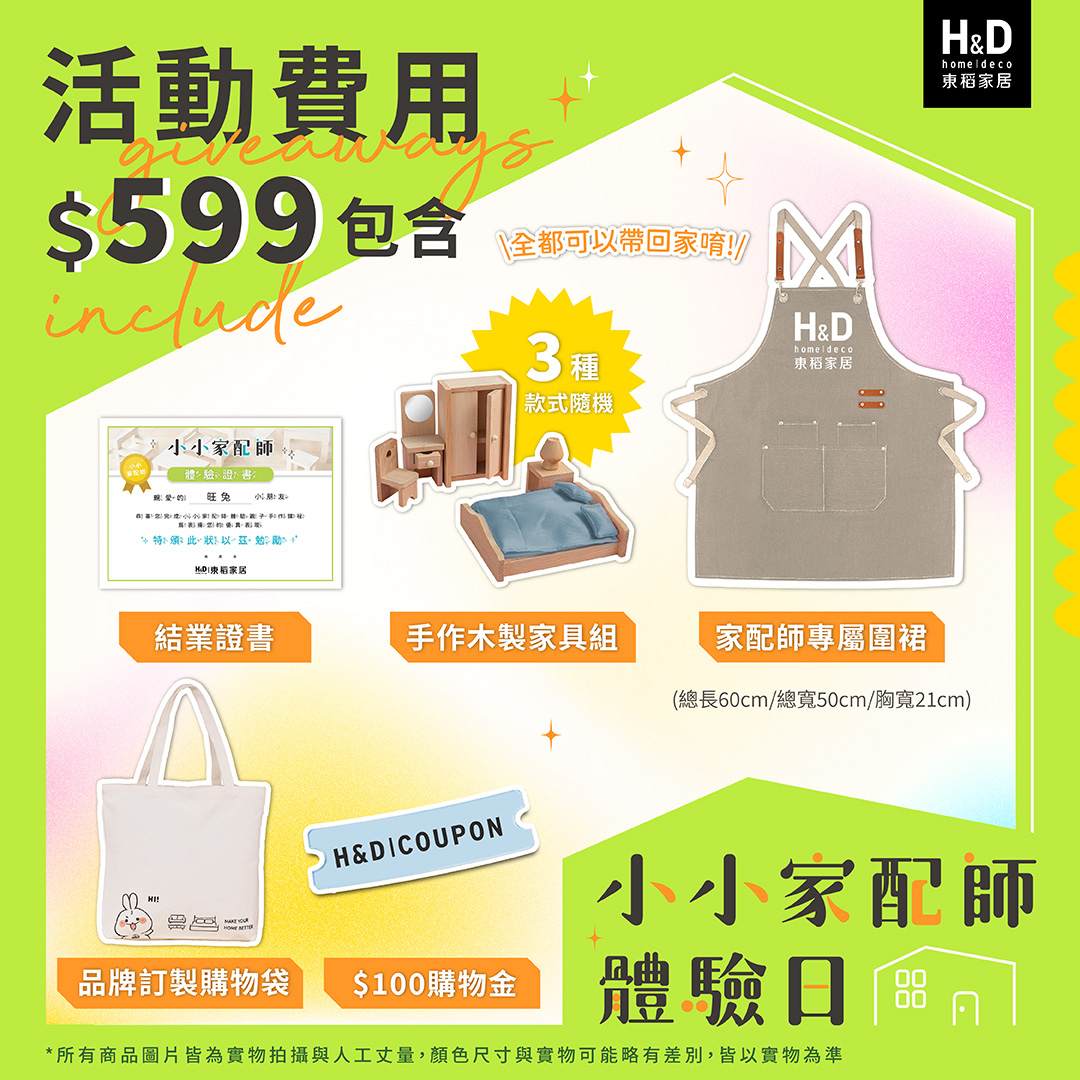 參加活動附贈小小家配師訂製圍裙、結業獎狀、手作木製家具組 ( 臥室、客廳、餐廳組 款式隨機,怒無法指定 ) 、品牌帆布購物袋、$100家具購物金。