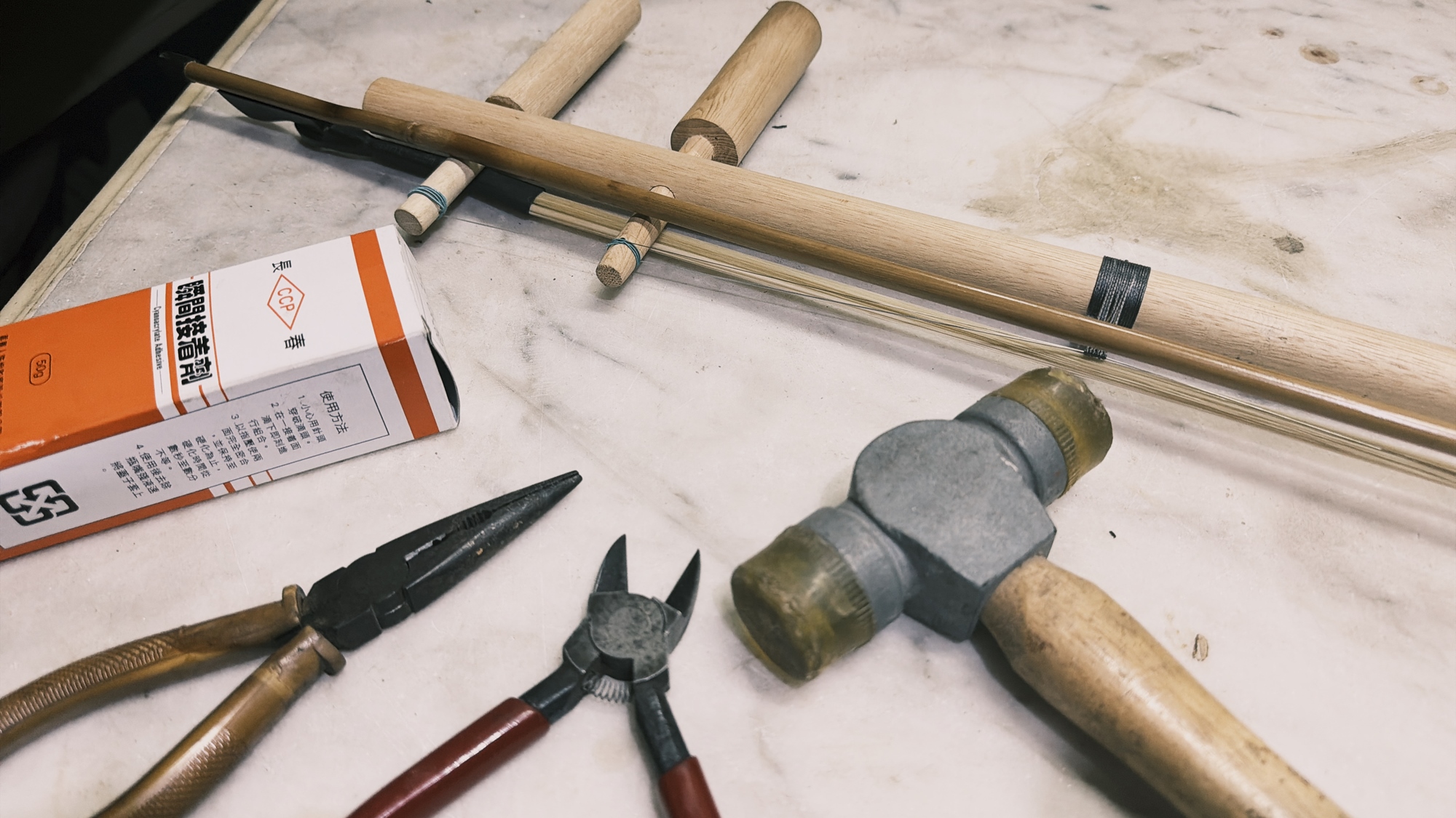 二胡本體木作、琴弓、琴弦、松香、耗材(接著劑、釘)