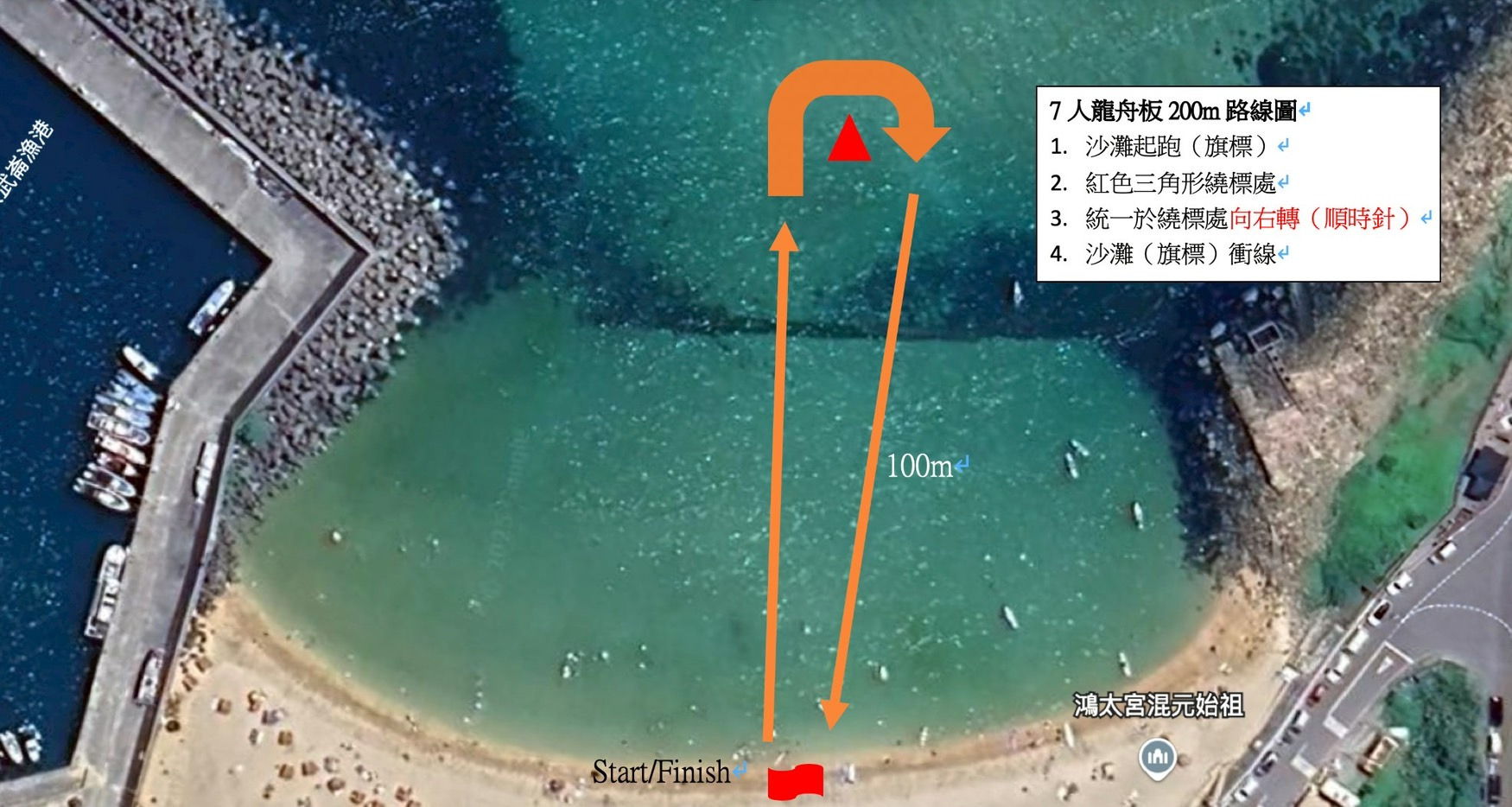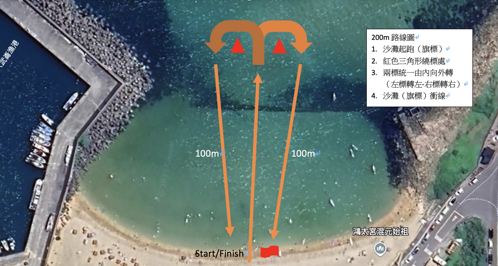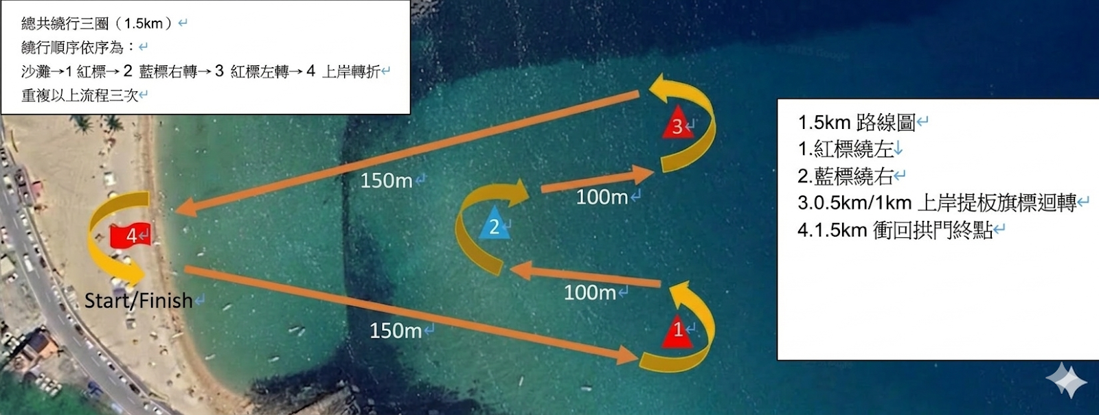 - 賽道長度:1500公尺 (500公尺x3)需沙灘起跑方式出發,需繞過標的外側才 算通過,如無按照官方指示繞標成 績無效。