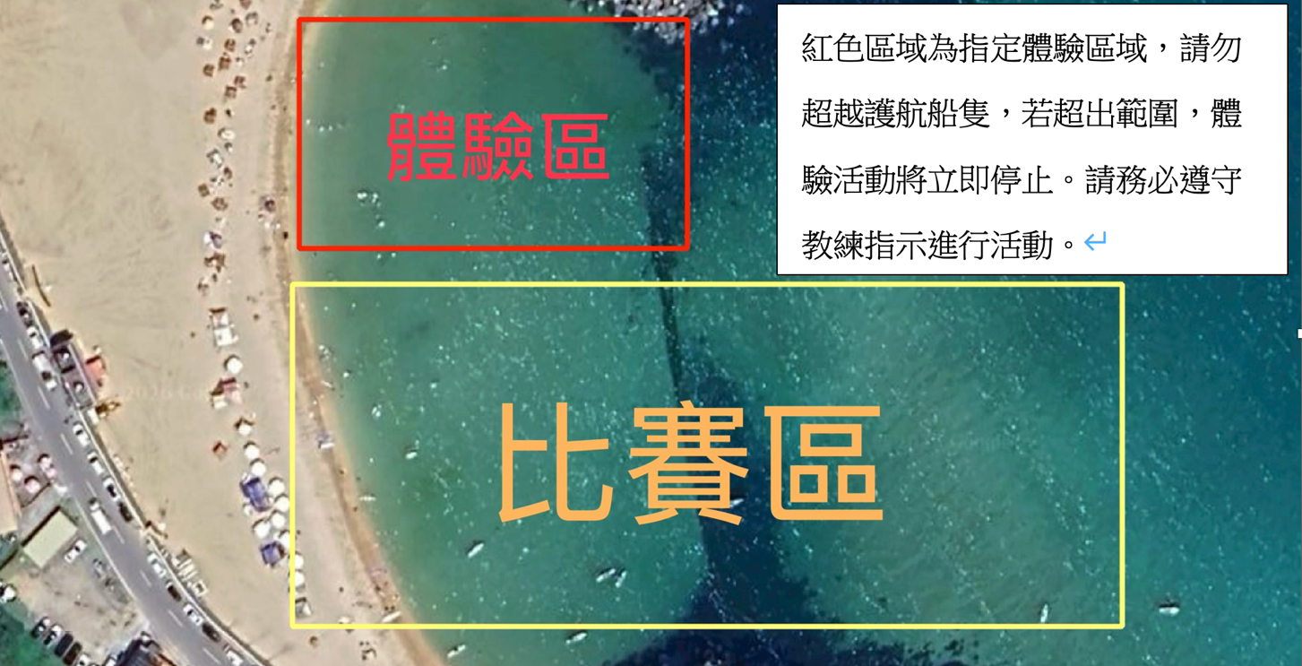 - 指定區域: 請於圖示 「紅色方框區域」 內進行體驗,嚴禁擅自超越護航船隻或防波堤。