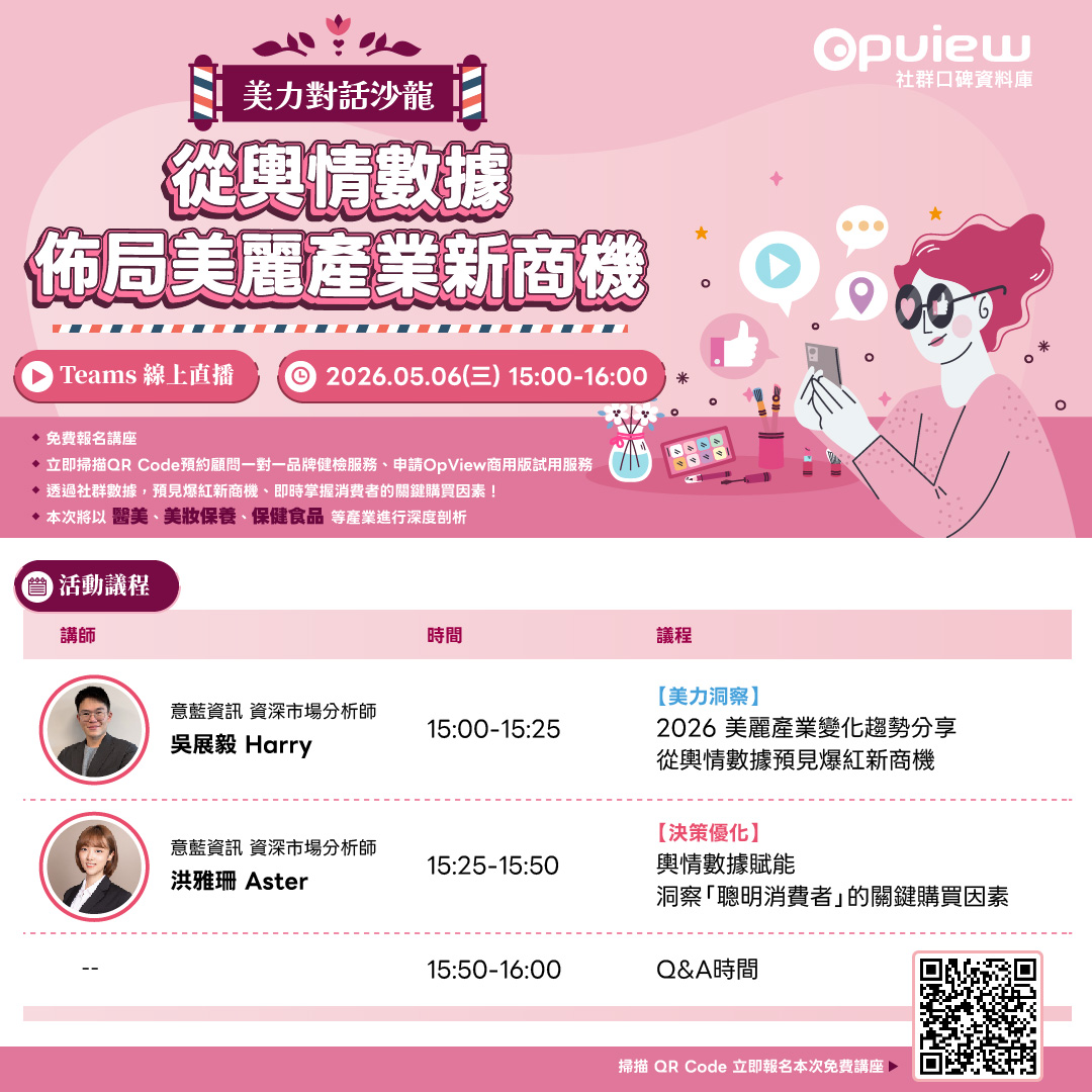 本次講座將透過輿情數據,解析消費者關注焦點與購買考量轉變,