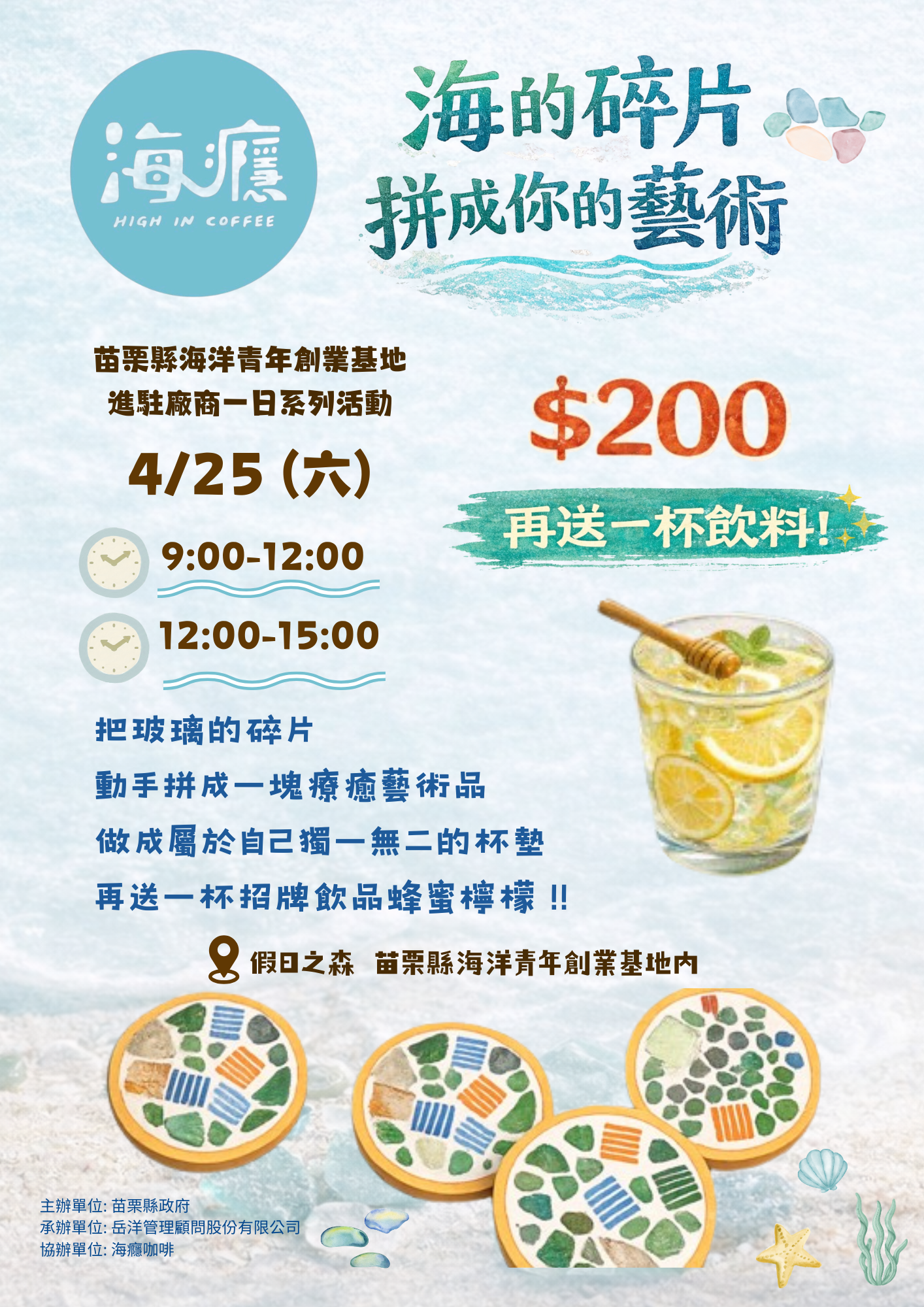 活動名稱: 進駐廠商一日系列活動-4/25 海玻璃杯墊手作體驗(贈送飲品)