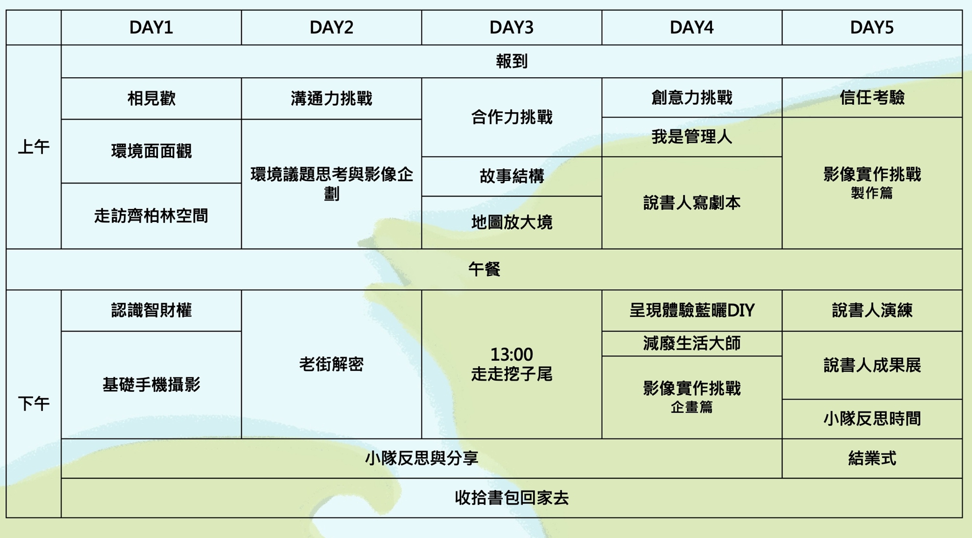 營隊時間⼁每日 09:00-17:00 五天不過夜