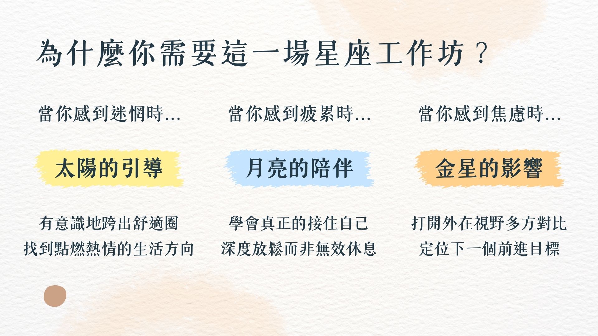 邀請你來到台中的實體空間,給自己一個下午的時間放下外在干擾,學會運用星座的特質,拿回生活的管理主權。