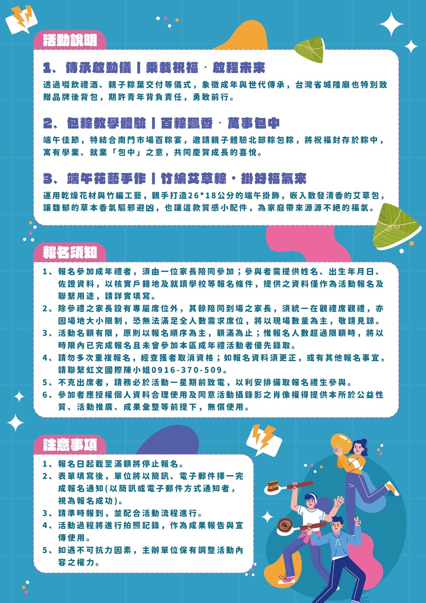 1、報名參加成年禮者,須由一位家長陪同參加;參與者需提供姓名、出生年月日、 佐證資料,以核實戶籍地及就讀學校等報名條件,提供之資料僅作為活動報名 及聯繫用途,請詳實填寫。