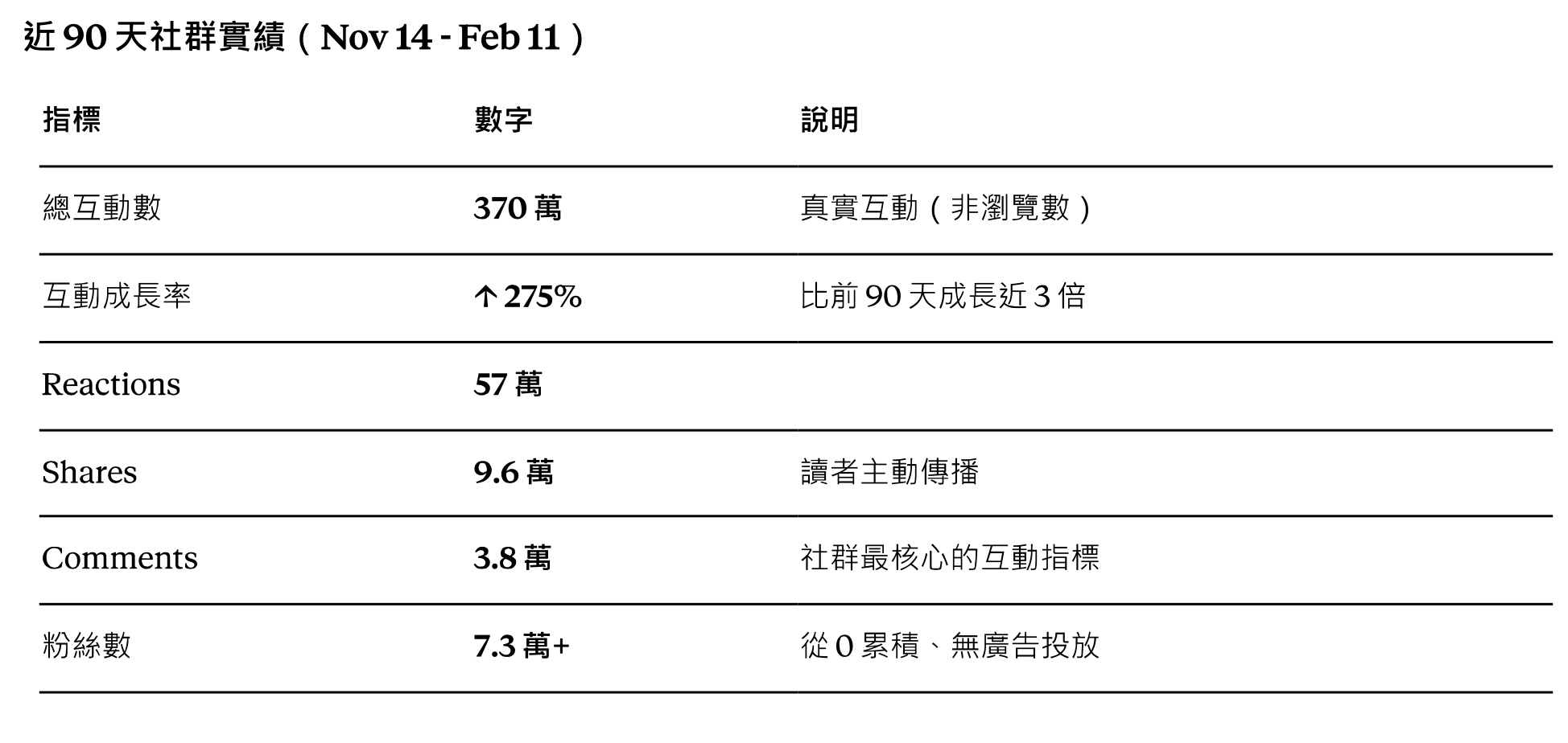 - 實戰戰績:達成 90 天內 370 萬次真實互動、9.6 萬次分享