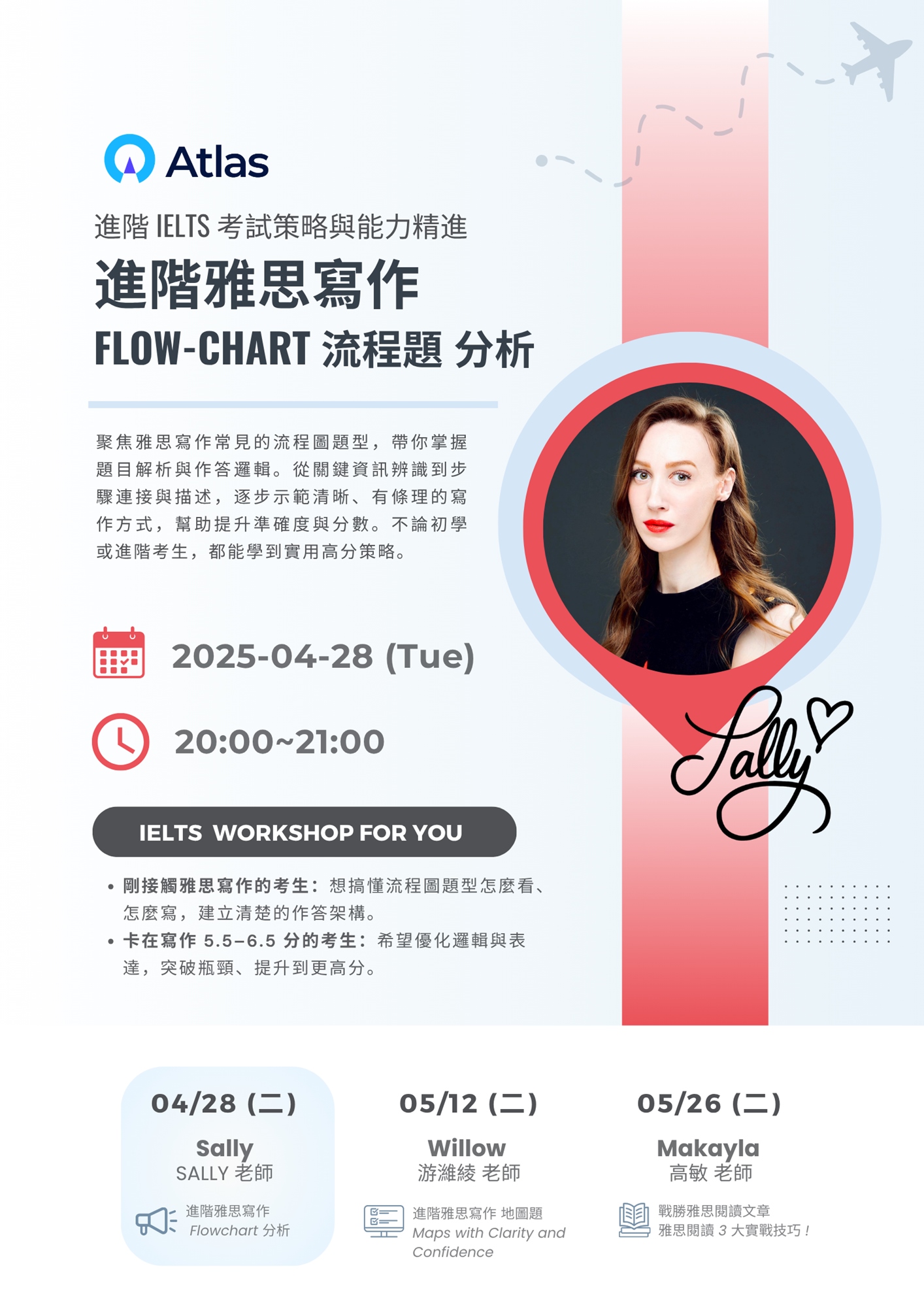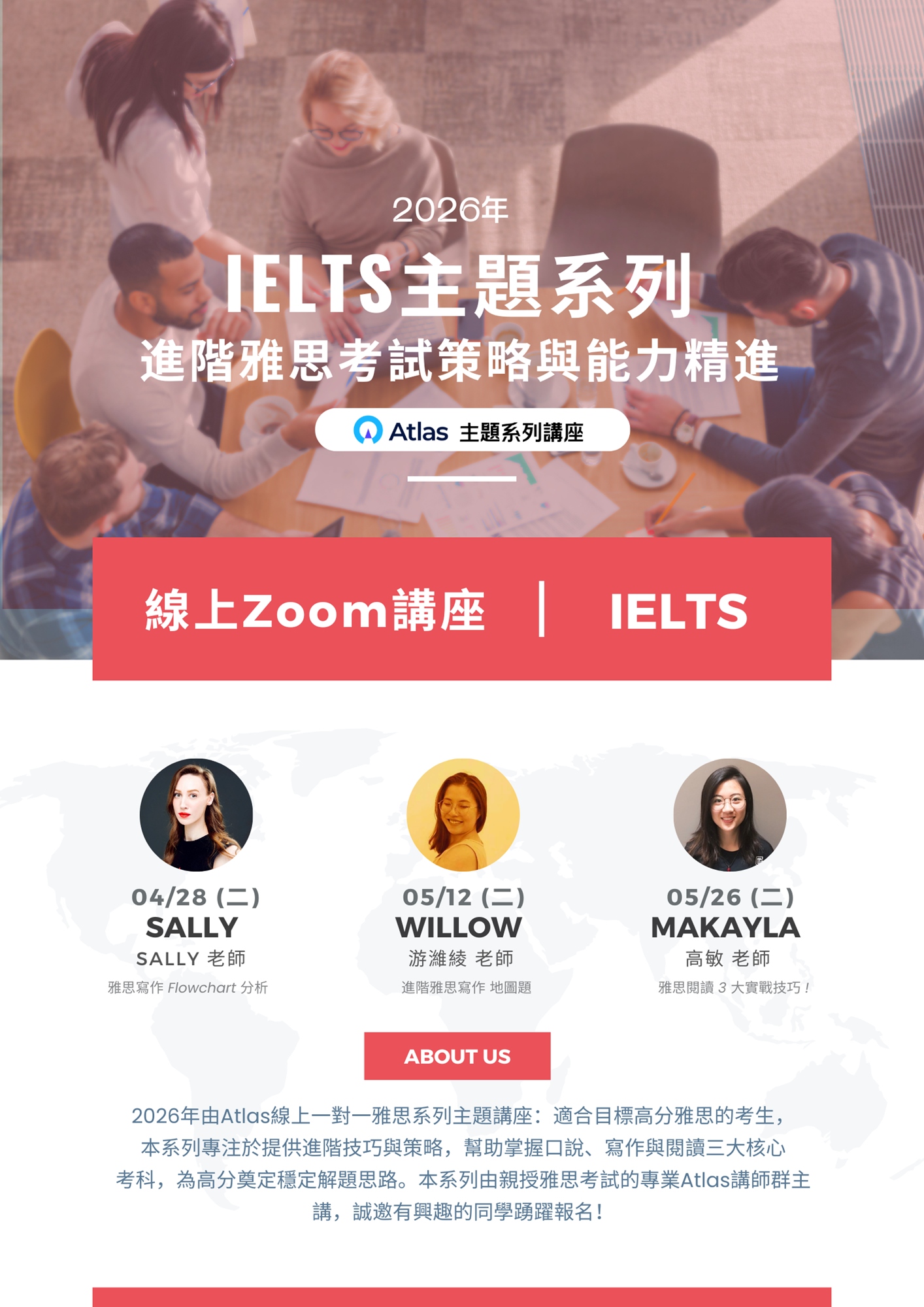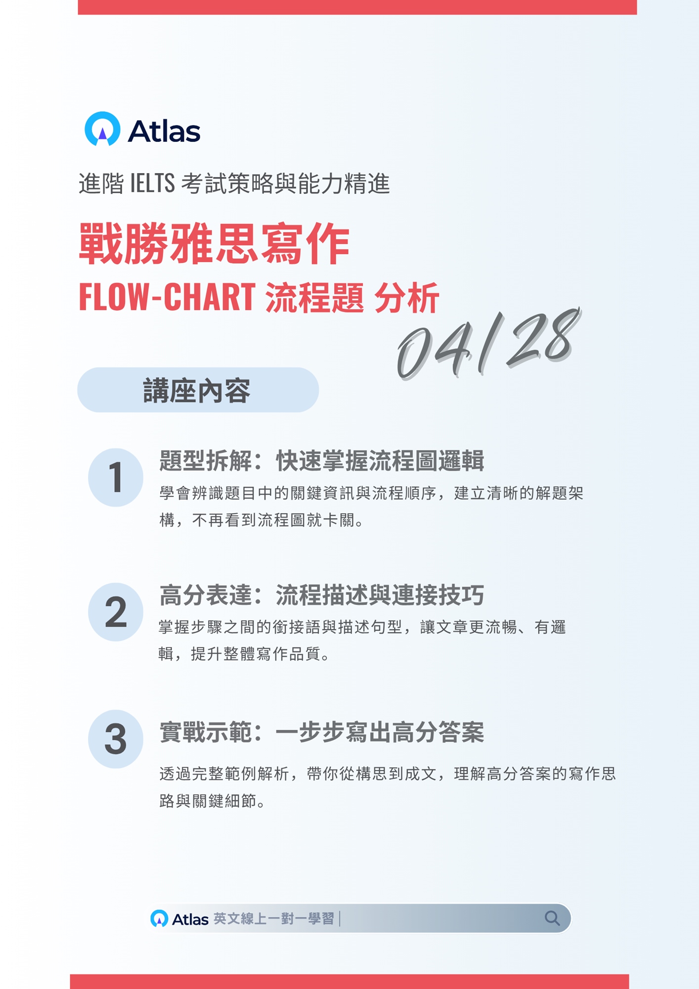 這場講座將聚焦於雅思寫作中常見的「流程圖(flow-chart)」題型,帶你系統性解析題目結構與作答邏輯。從題目關鍵資訊的辨識,到步驟之間的連接與描述方式,老師將一步步示範如何清楚、有條理地呈現流程,幫助你提升寫作的準確度與分數表現。不論你是初學者還是希望精進技巧的考生,都能在本講座中掌握實用策略,寫出更流暢且高分的答案。