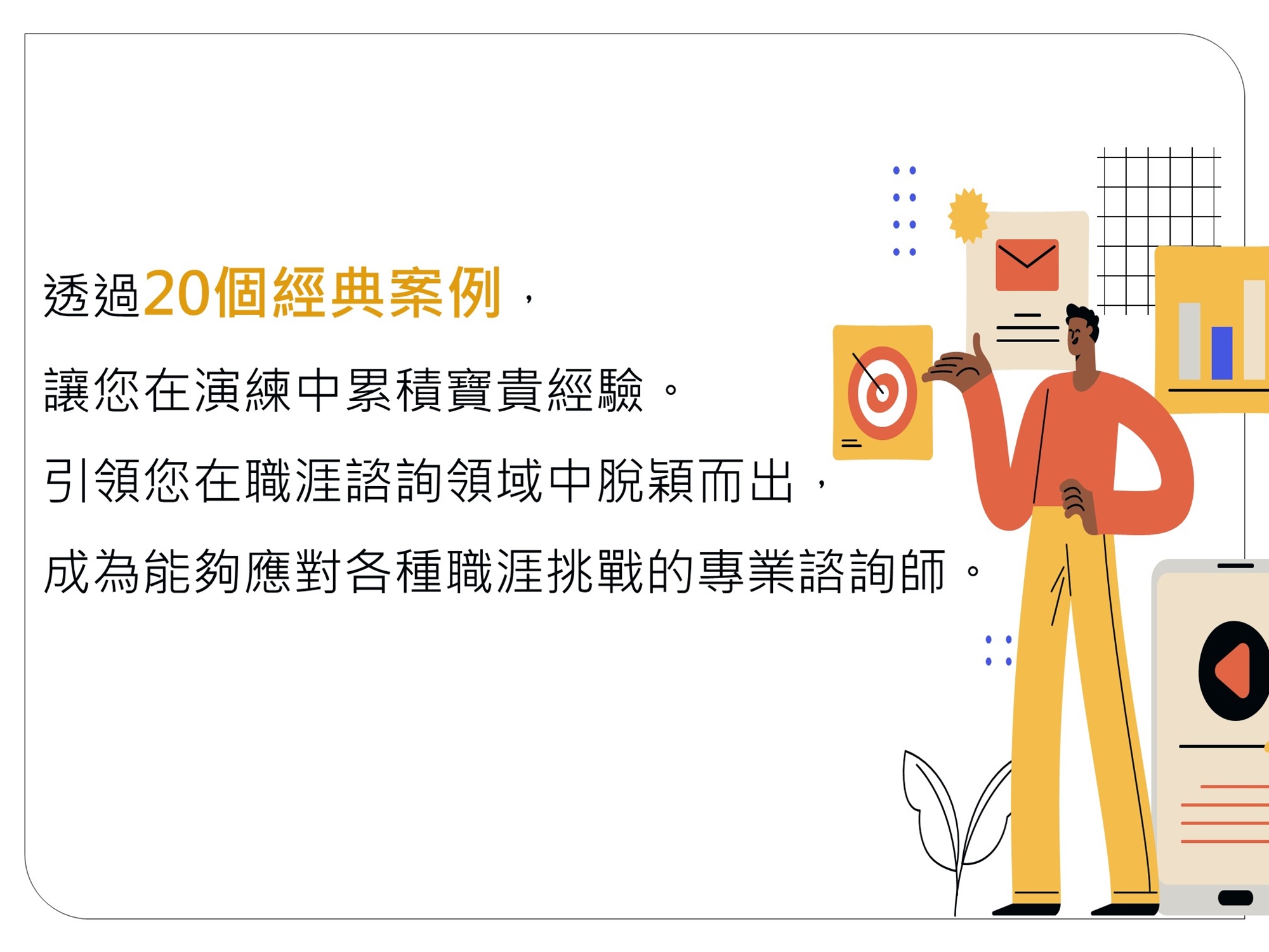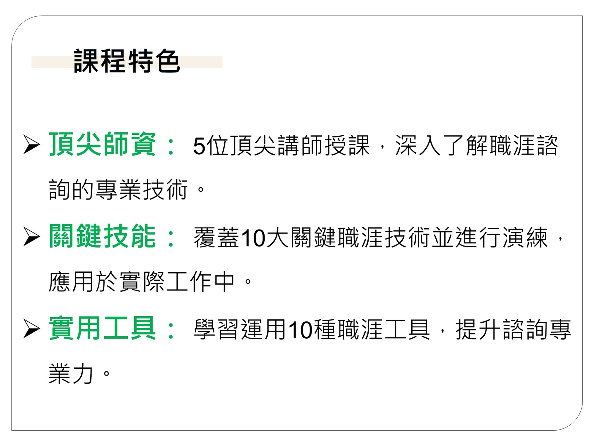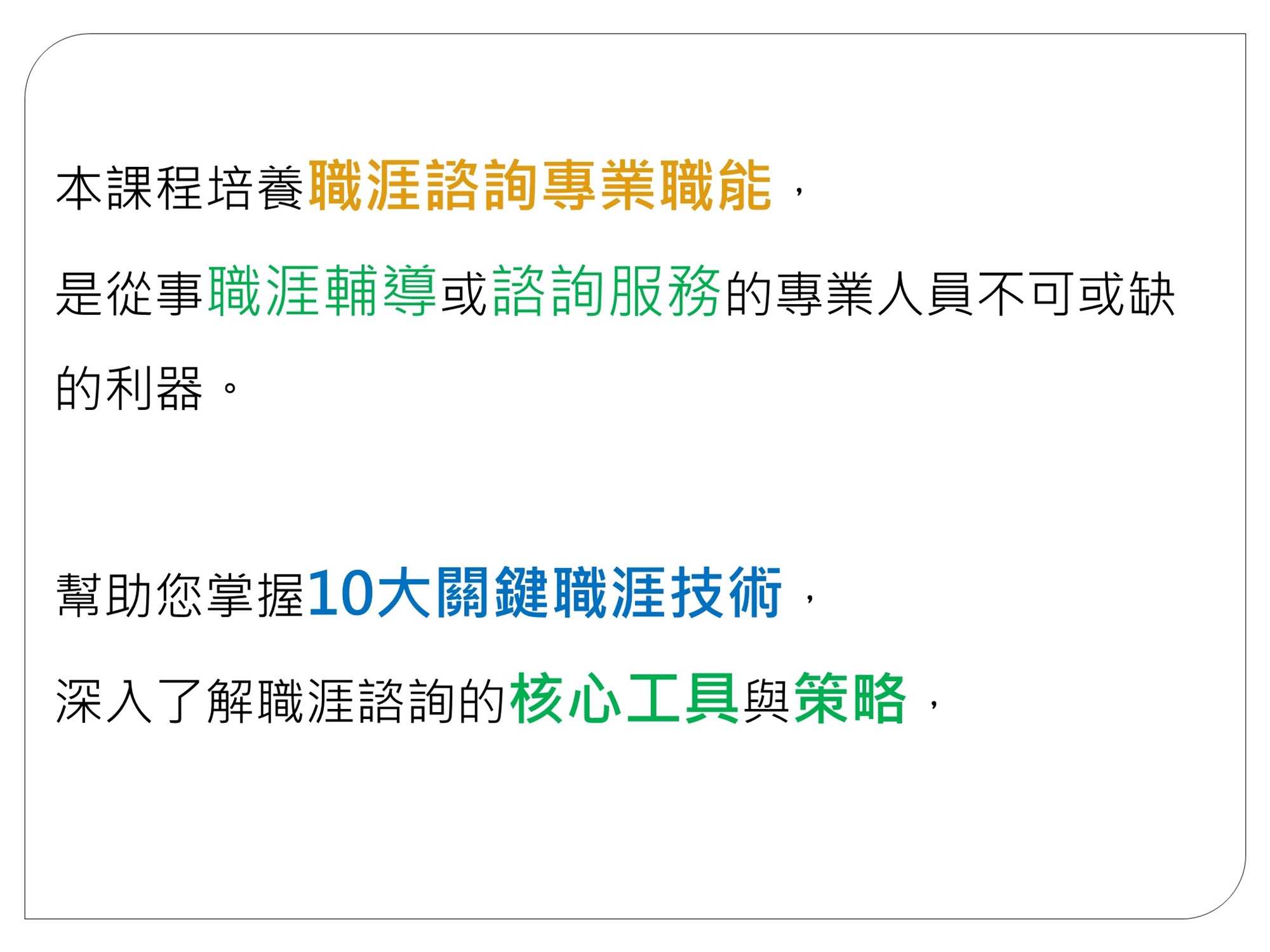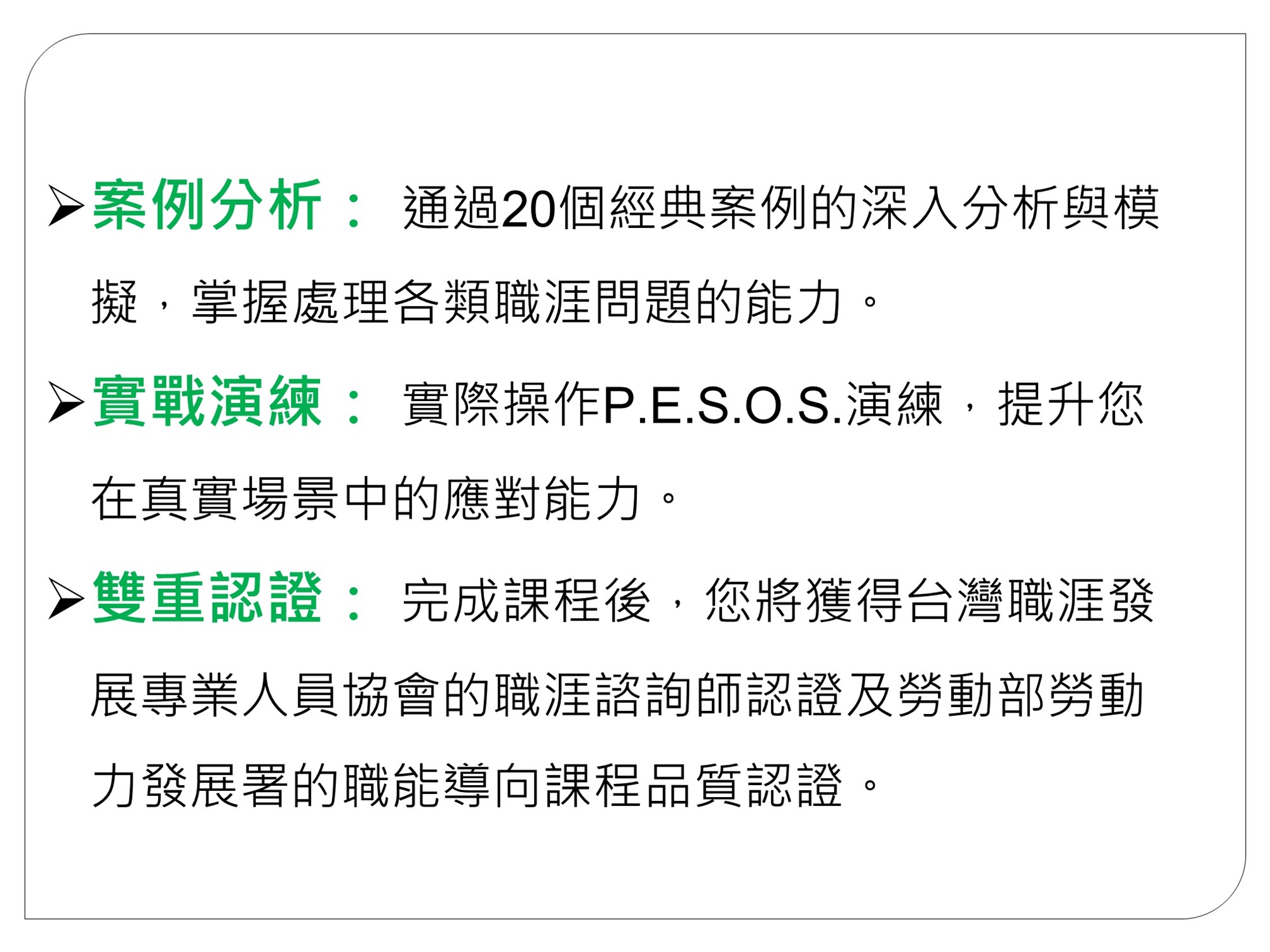 本課程著重於「職涯諮詢經典技術」的紮實養成,帶領你跨越「憑直覺給建議」的限制。