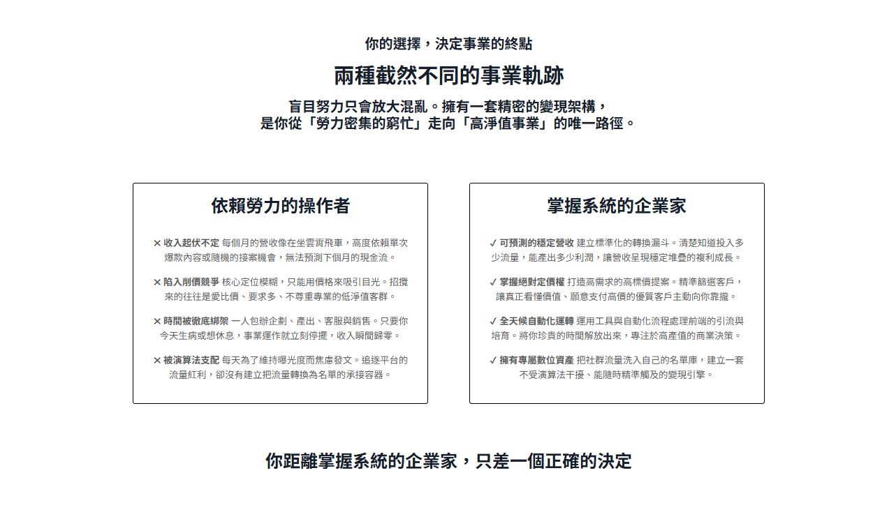 別再當算法的奴隸,現在就加入這套實戰驗證的系統,建立具備高利潤、可預測性的數位資產,正式升級為真正的事業擁有者!