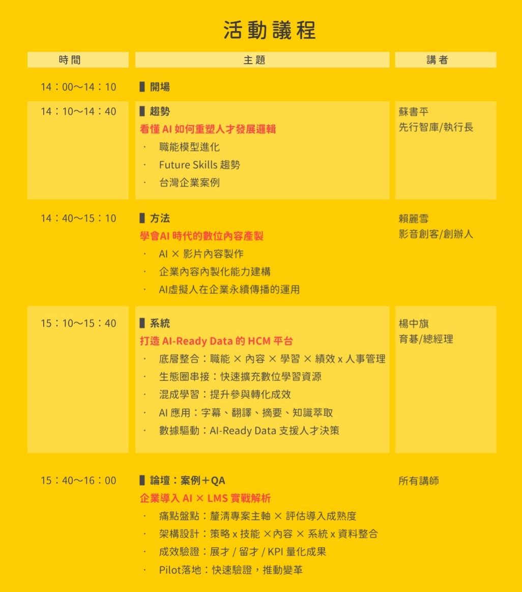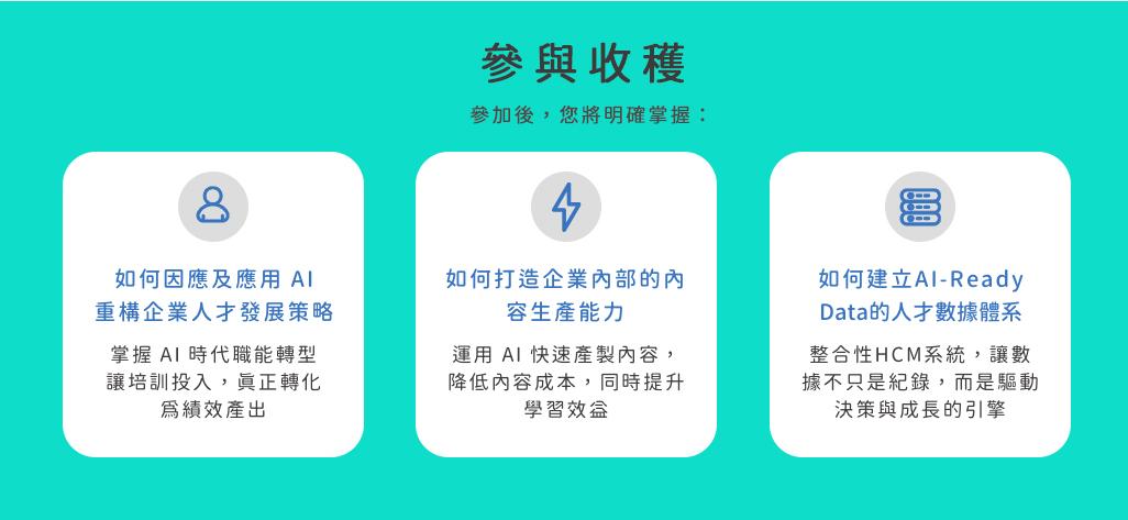本活動聚焦「AI 驅動人才發展」,解析企業如何透過 AI × HR 系統 × 數據整合,打造具備決策力與競爭力的人才策略。內容涵蓋 AI 在培訓、績效、人才盤點與學習歷程的實務應用,並結合影音內容策略,協助企業有效推動內部學習與知識傳播。