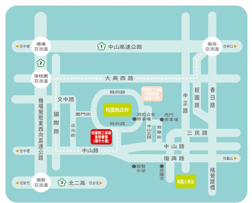2.搭乘桃園(中壢)客運1路公車於桃園市政府站下車(桃園火車站乘車處:火車站前復興路警局桃園分局對面,約10分鐘車程)。