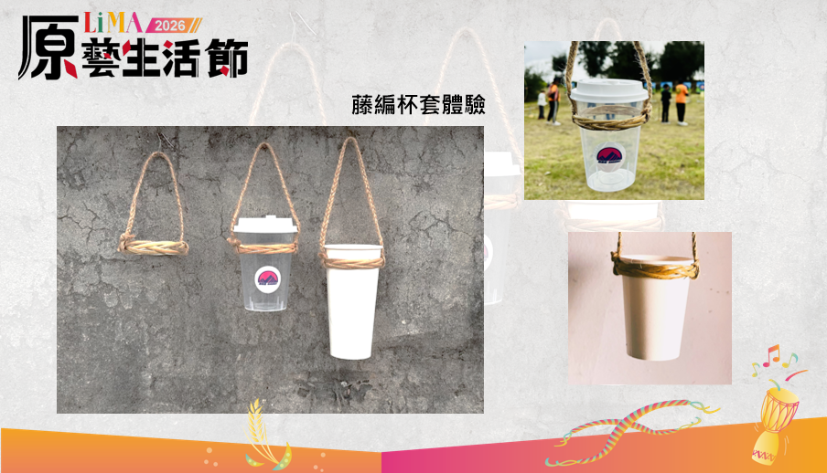 黃藤編織為泰雅族常見且多元的生活工藝。為推廣藤編文化,特別設計藤編杯套DIY體驗,結合現代飲品使用習慣與環保理念,將傳統編織技法轉化為實用日用品,讓參與者在手作過程中認識並感受原住民族工藝之美。