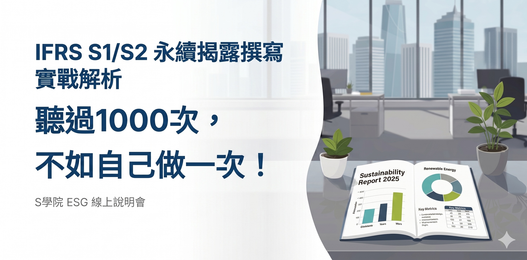 4月22日(三)20:00 S學院ESG線上說明會分享主題 : 台積電 辨認永續相關風險與機會及財務影響 以及評估永續相關重大財務資訊解析