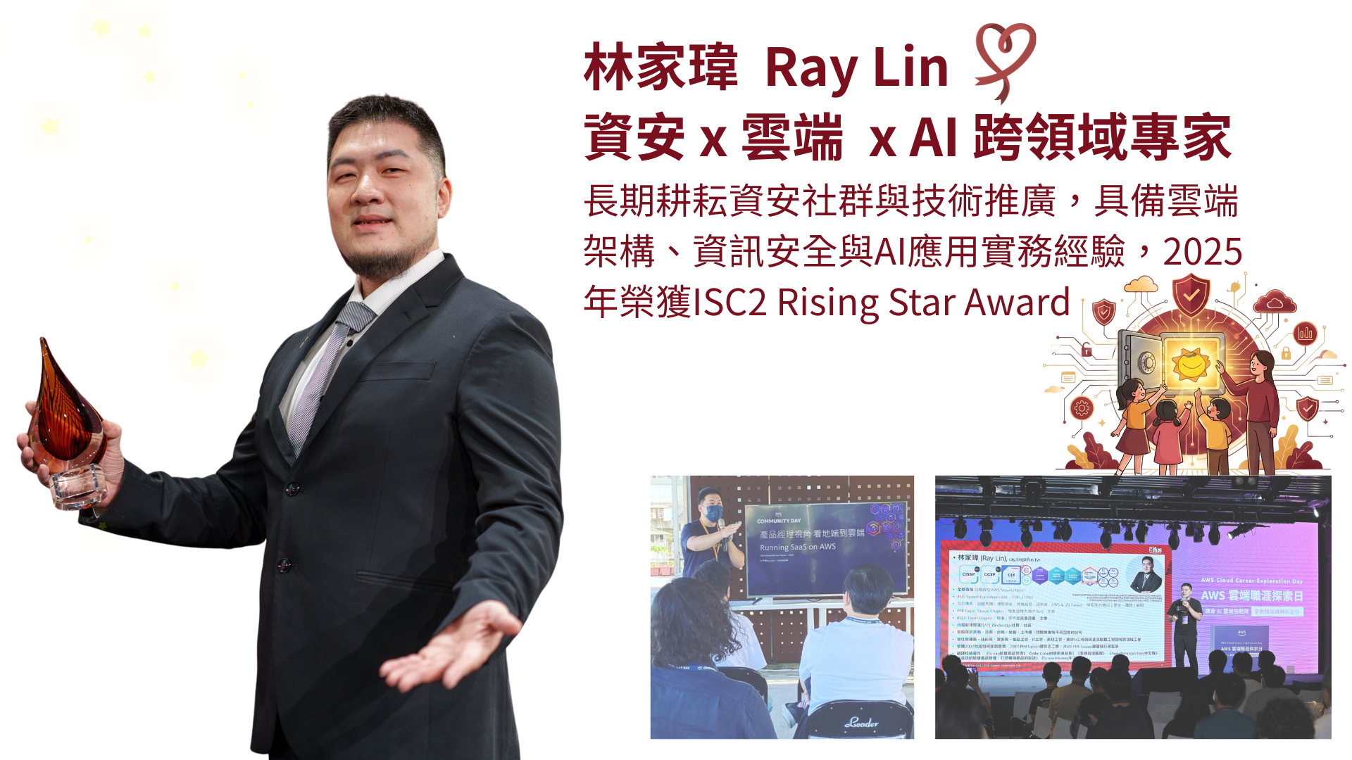 從事軟體產業近二十年,擅長從0到1組建團隊與開發新產品,主要專長為資訊安全與稽核、DevSecOps、AI、AWS雲端架構設計、BA與SA、軟體專案管理與SaaS敏捷產品開發等。Ray曾獲得台灣發明家創意獎、EC-Council Cybersecurity Career Mentor,經歷過美商、日商、台商、新創、上市櫃、跨國集團等不同型態的公司並擔任跨領域高階主管,授課單位超過百間。除了持有資安、雲端、AI、專案管理、敏捷等超過50張國際專家證照之外,目前也是全球首批GCR首位AWS Security Hero、DevSecOps Taiwan社長、PMI Taiwan獎項辦公室執行長,負責舉辦媒體譽為華人專案管理界奧斯卡獎的專案管理大獎(PTGA),至今亦翻譯出版7本知名敏捷書籍